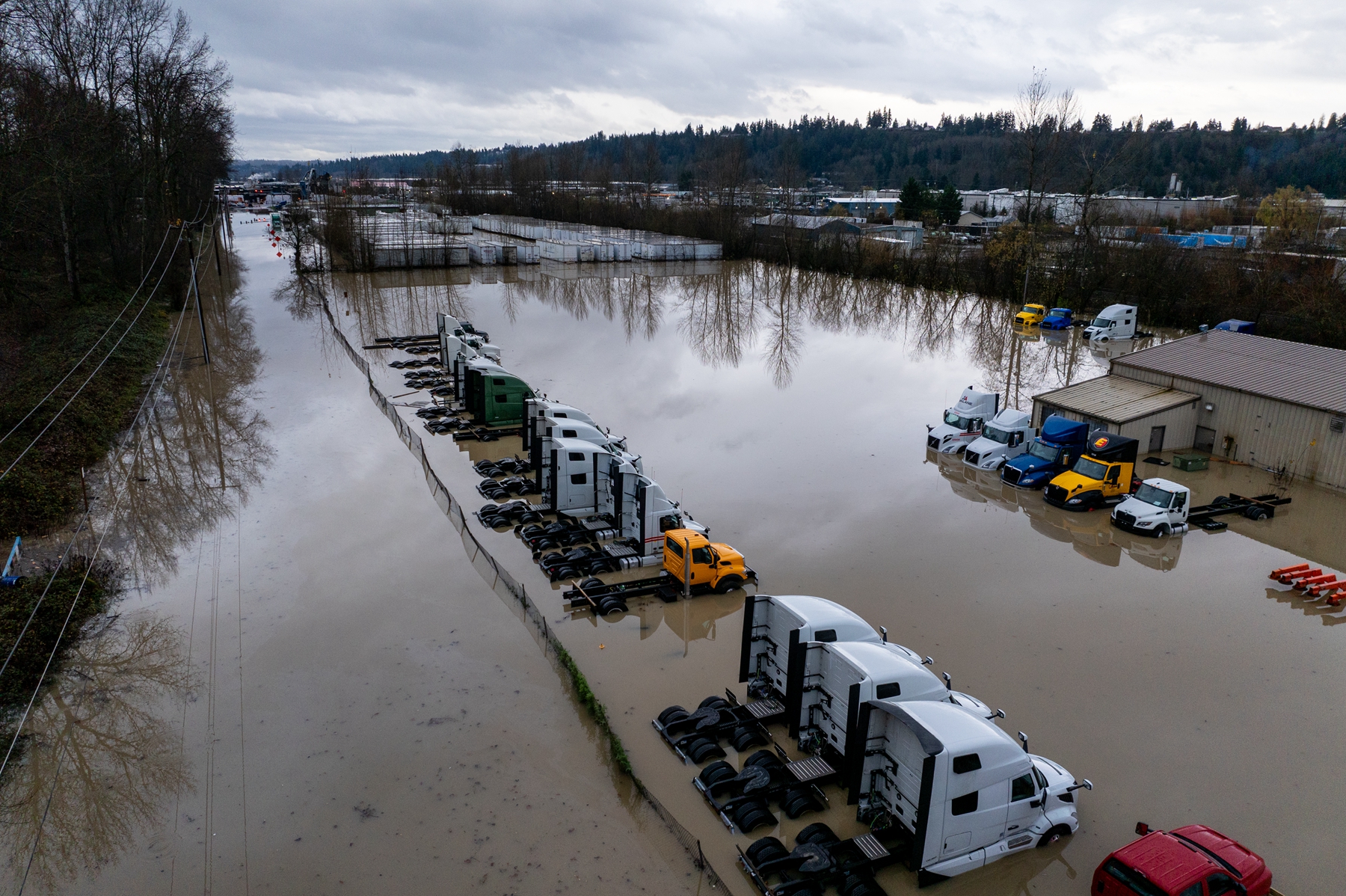 2025年12月16日,华盛顿州金县太平洋城发生严重洪涝灾害,许多半挂卡车浸泡在洪水中。(Brandon Bell/Getty Images)