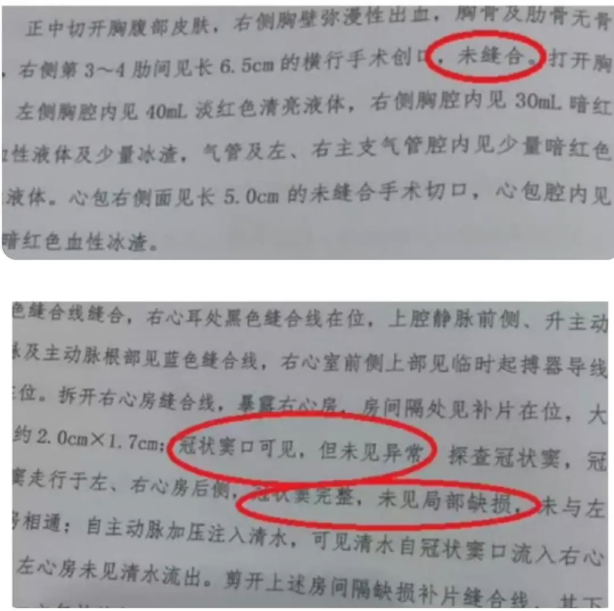 此外,她公布的部分尸检报告还显示,“正中切开胸腹部皮肤,右侧胸壁弥漫性出血,右侧第3—4肋间见长6.5cm的横行手术创口,未缝合。”“剪开上述房间隔缺损补片缝合线,其下见另一心包补片部分在位,未覆盖房间隔缺损全部,一侧缝合于房间隔缺损下后缘处,另一侧游离状,大小约为1.4cm×0.5cm,房间隔缺损大小为 1.0cm×0.9cm。”家属质疑实施手术人员未对孩子的伤口进行缝合,且将手术补片留在了孩子的心脏中。