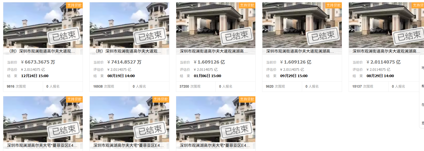 拍卖信息显示,此次拍卖的标的物为“深圳市观澜街道高尔夫大道观澜湖高尔夫大宅*蔓菲亚区E4栋房地产及附属设施、设备(第八次)”,“起拍价:6673万3675元,评估价2亿114万750元”,参加拍卖需缴纳“证金1334万元”。