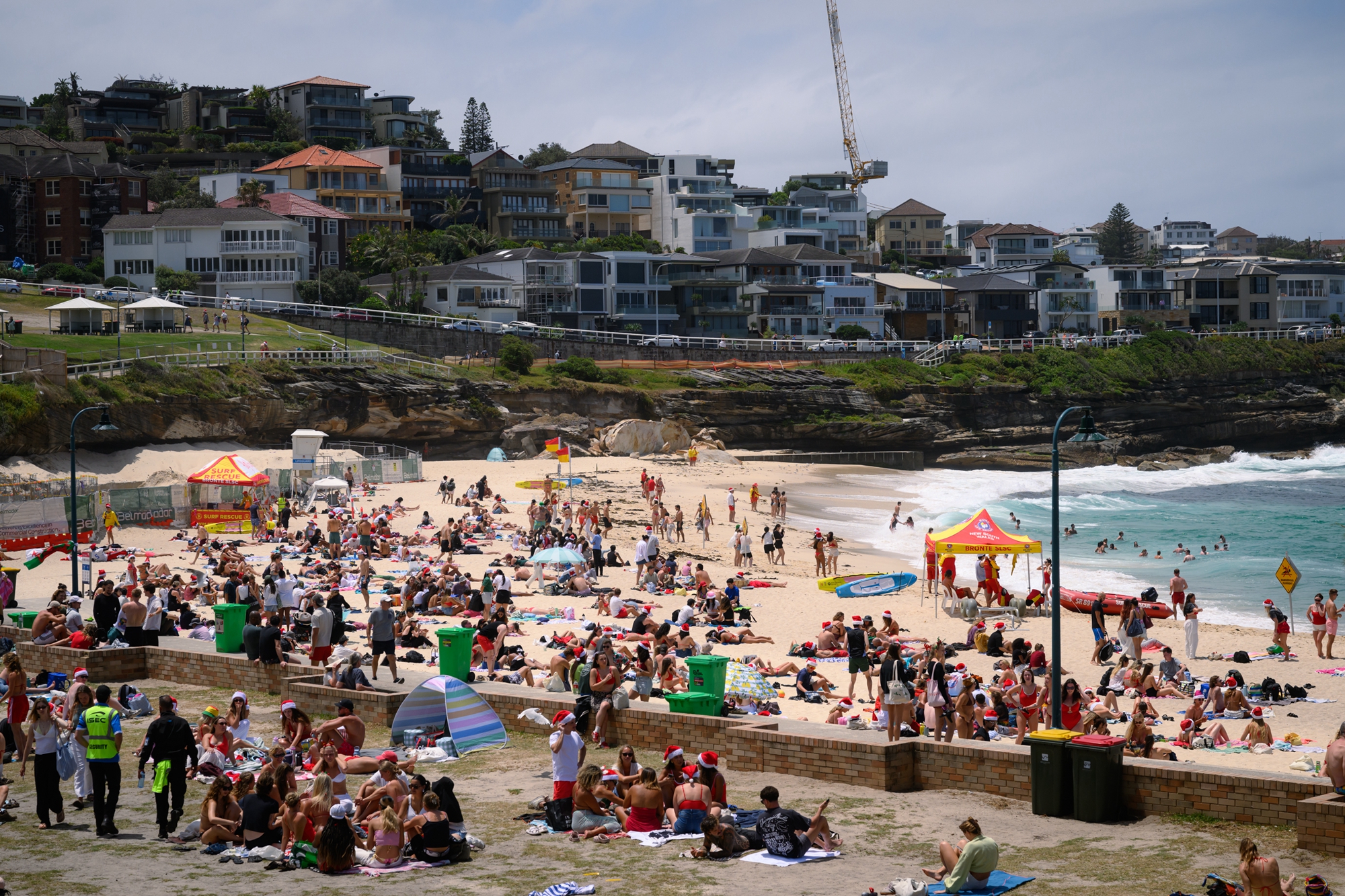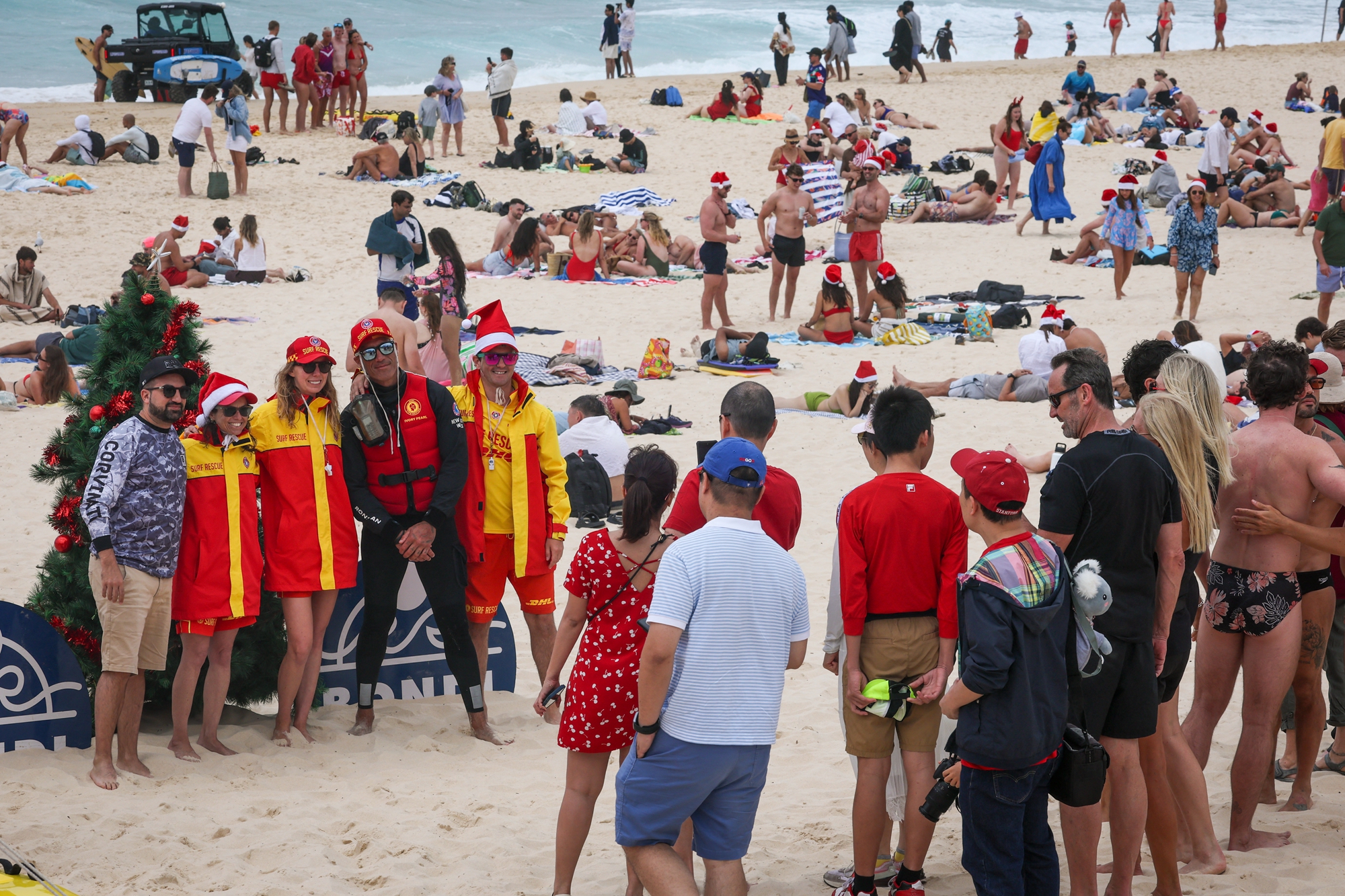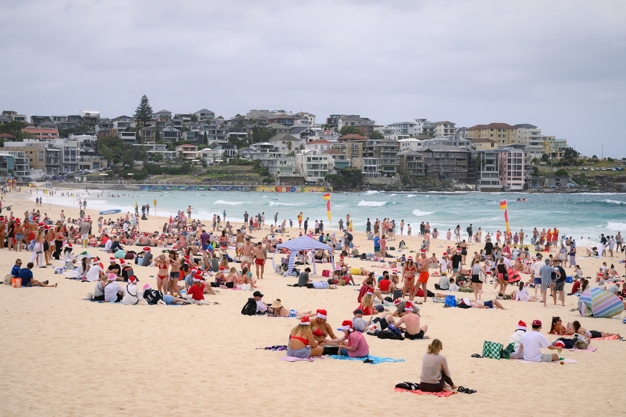 至于南半球的澳大利亚,则有不少民众前往沙滩庆祝,身穿泳衣、头戴圣诞帽享受太阳和微风,其中包括前不久刚刚发生恐袭案的知名度假和冲浪胜地邦岱海滩(Bondi Beach)。