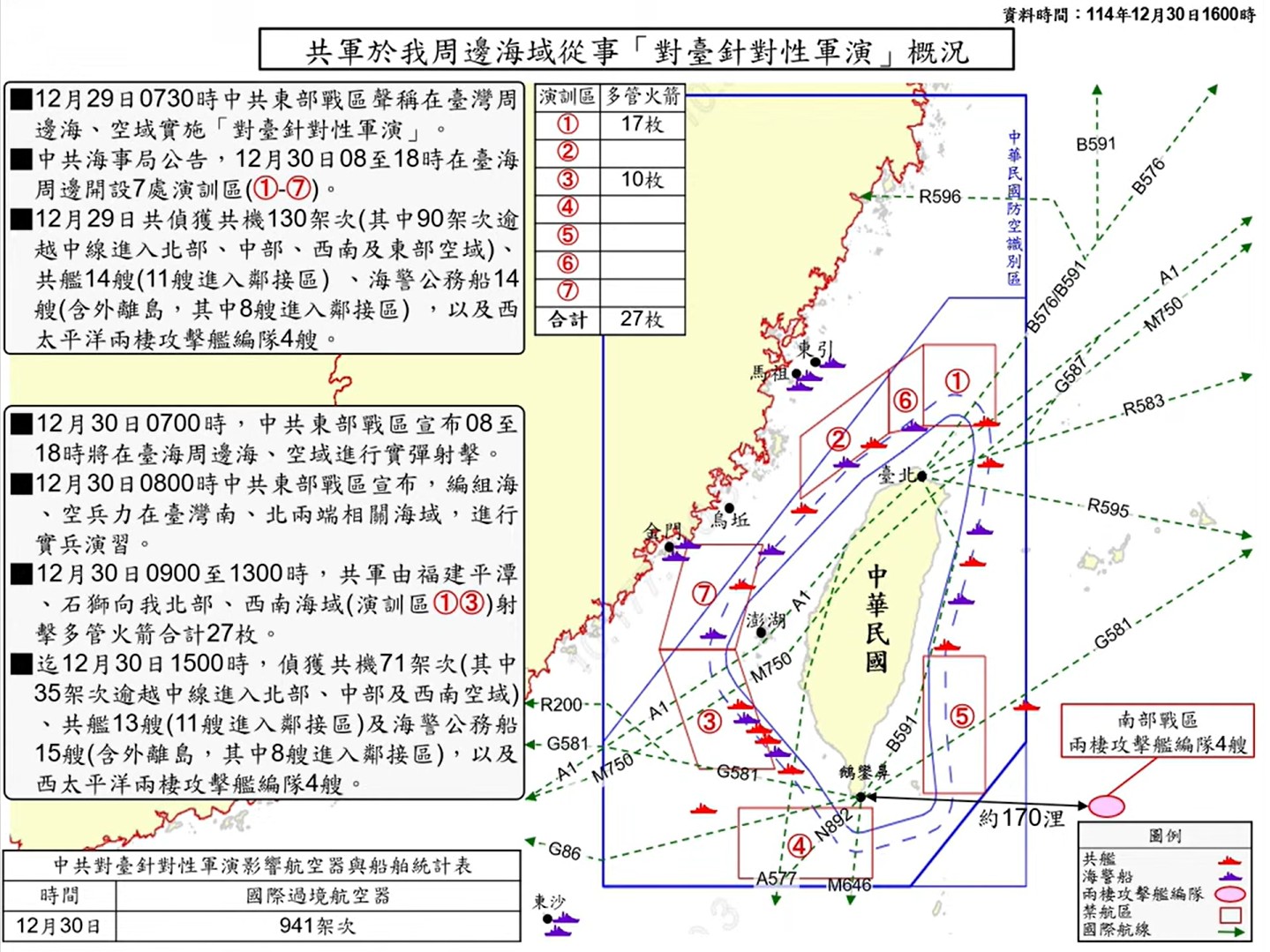 中共宣布12月29日演习,台湾军方在12月29日6时前,已经侦获共舰9艘、公务船2艘;到12月30日6时,增加到共舰14艘、公务船8艘;到12月31日6时,再增加到共舰17艘及公务船8艘。