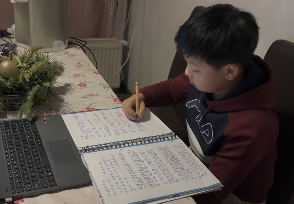 在同为法轮功修炼者的老师协助下,孩子开始系统学习中文,至今已持续两年。如今,吕世涵已能与母亲一起阅读《转法轮》,虽仍需偶尔提醒,但已能理解大意,并逐步将法理落实于生活。