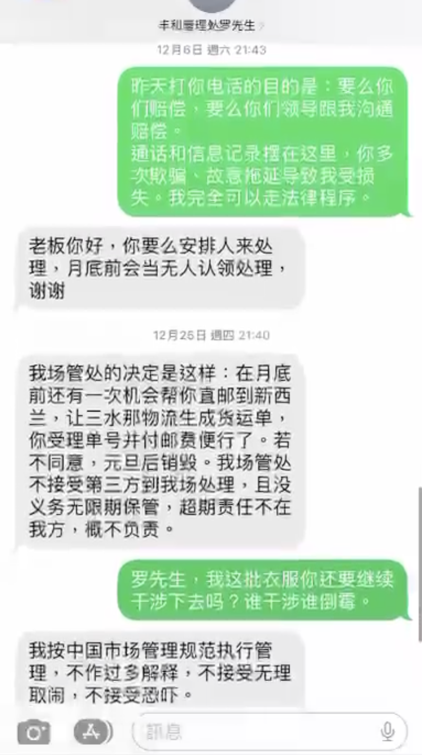 与管理处负责人对话截图显示,对方要求直接发货到新西兰,不接受第三方处理。(受访者提供)