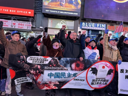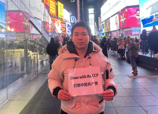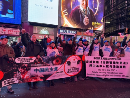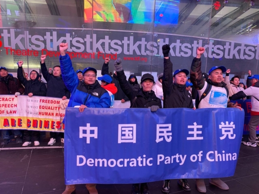 中国民主党成员在纽约时代广场高喊:“打倒中国共产党!共产党下台!”他们说,今天喊起来特别起劲,特别有底气。