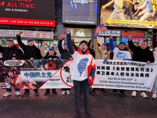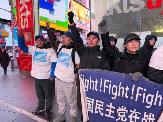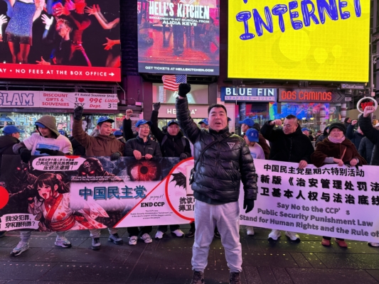 中国民主党成员在纽约时代广场高喊:“打倒中国共产党!共产党下台!”他们说,今天喊起来特别起劲,特别有底气。左二为杨羚。(林丹/大纪元)