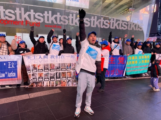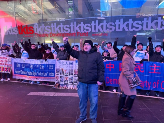 中国民主党3日晚上在纽约时代广场举行每周一呼的茉莉花活动,抗议中共暴政和迫害。虽然天气寒冷,但是马杜罗被生擒的消息让他们兴奋。他们高喊:“打倒中国共产党!共产党下台!习近平下台!暴政必亡!Free Free China !”他们的呐喊声吸引了不少行人停下脚步拍照及询问了解。