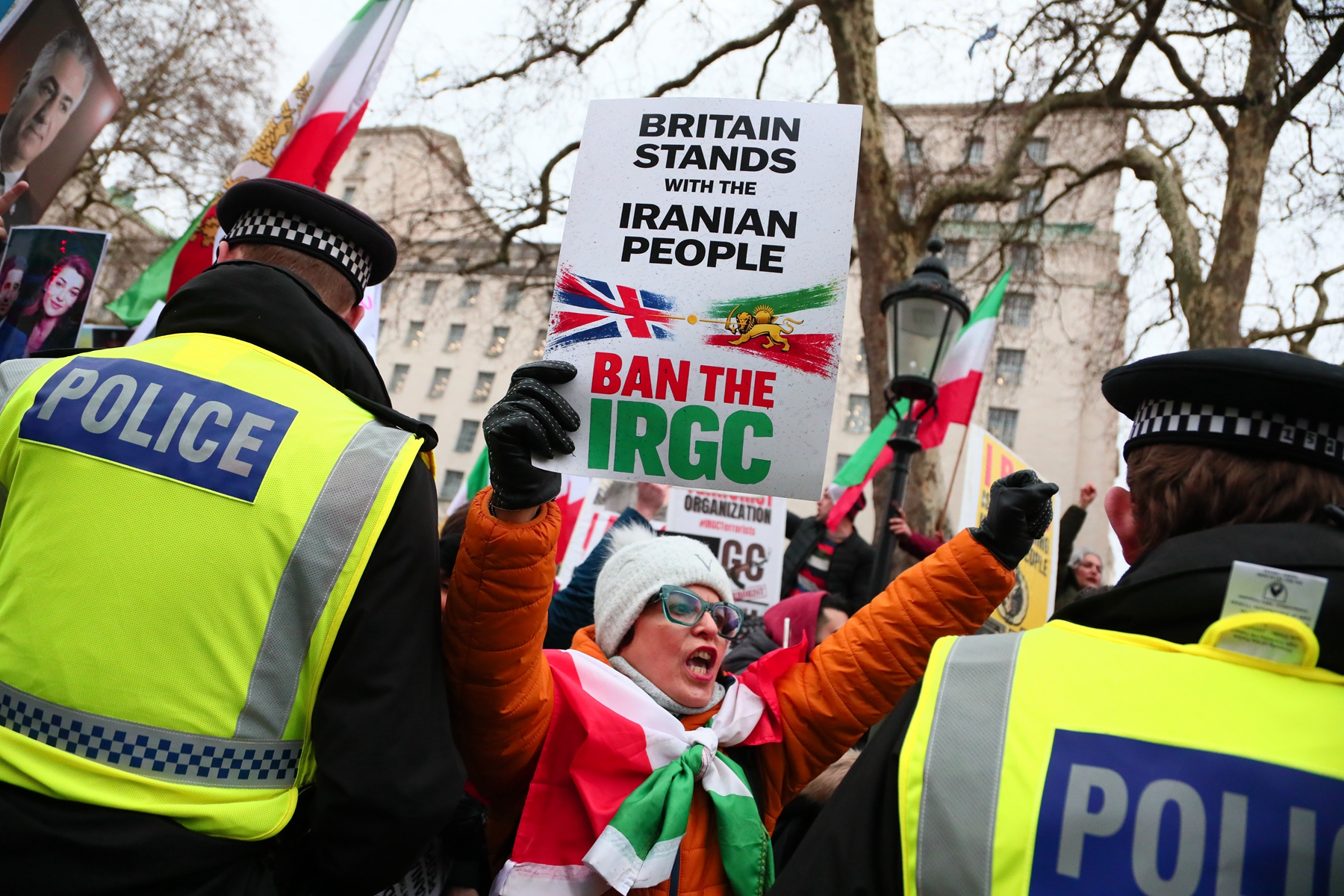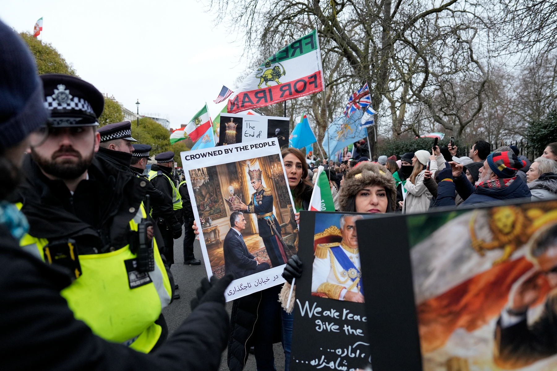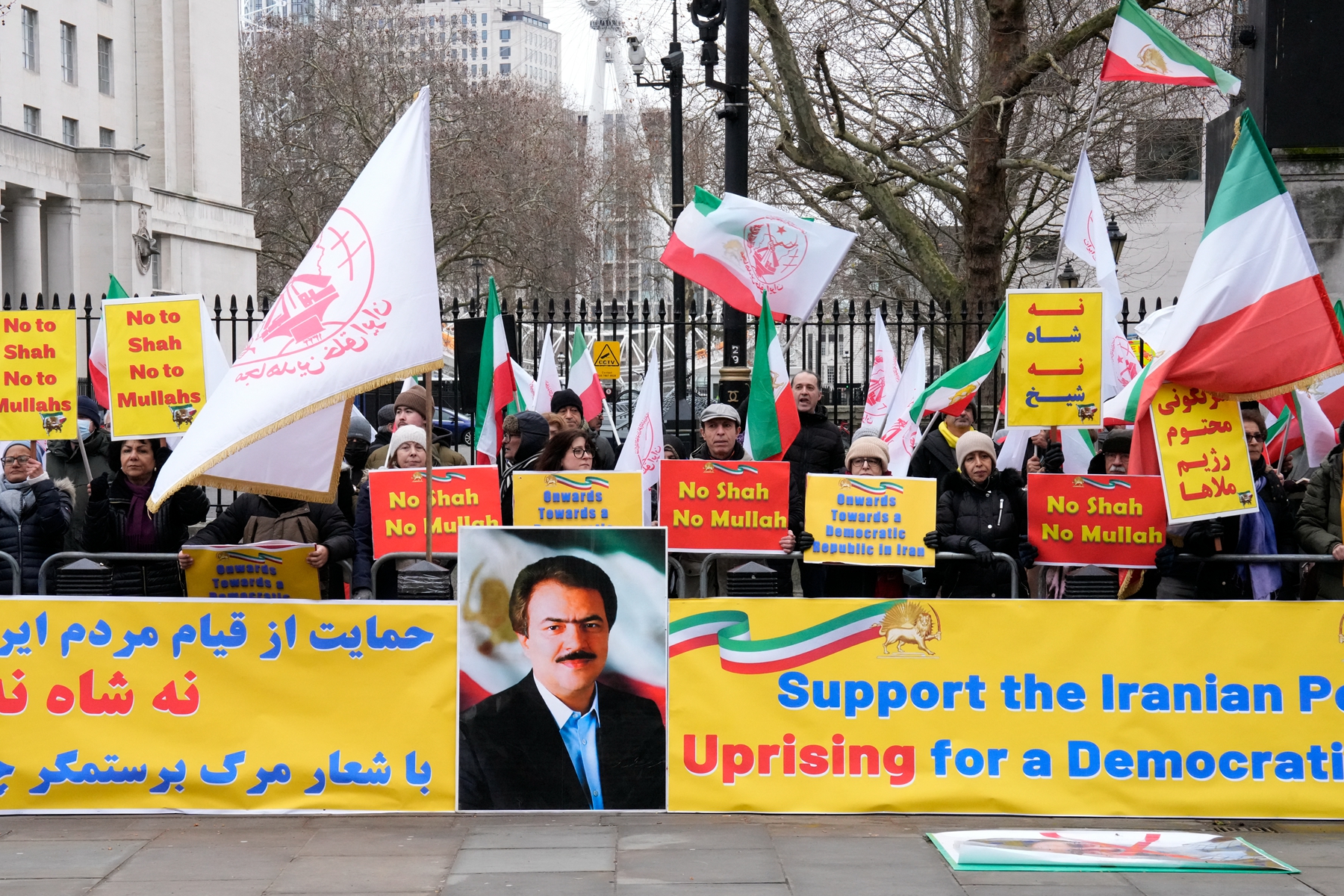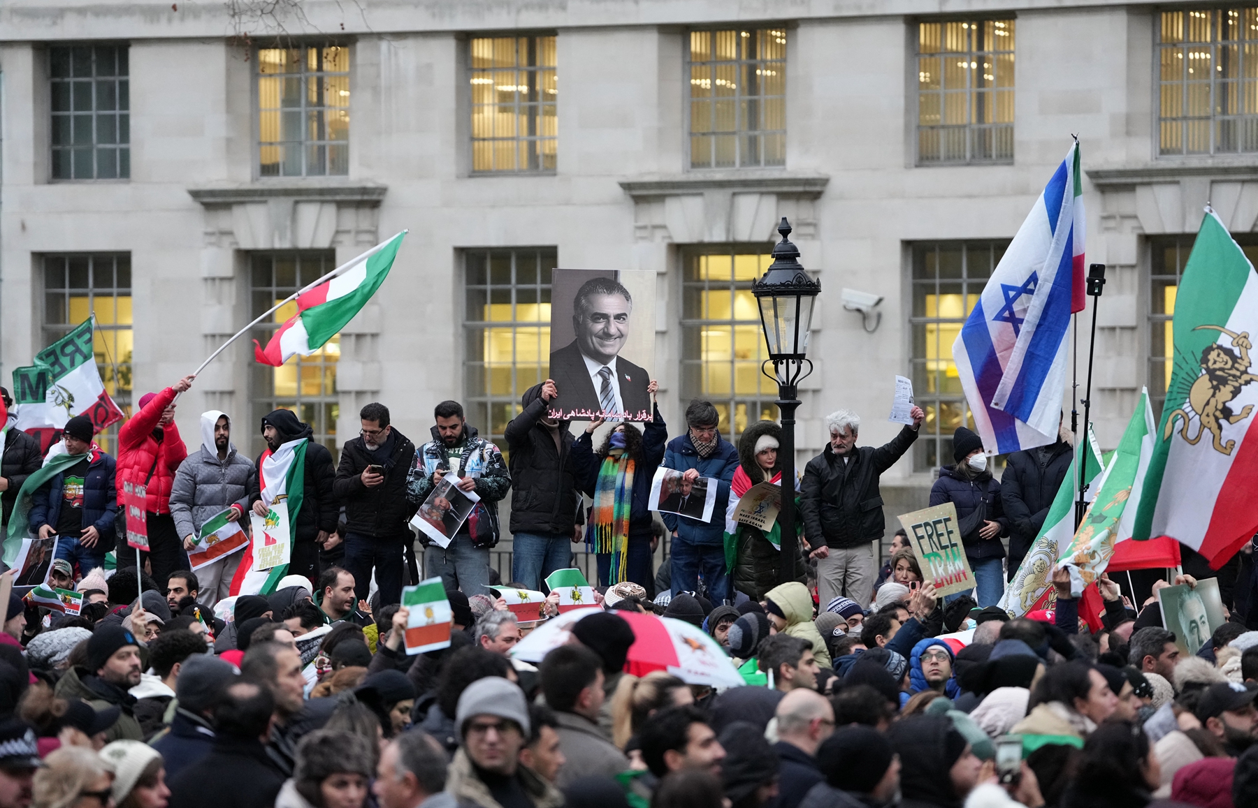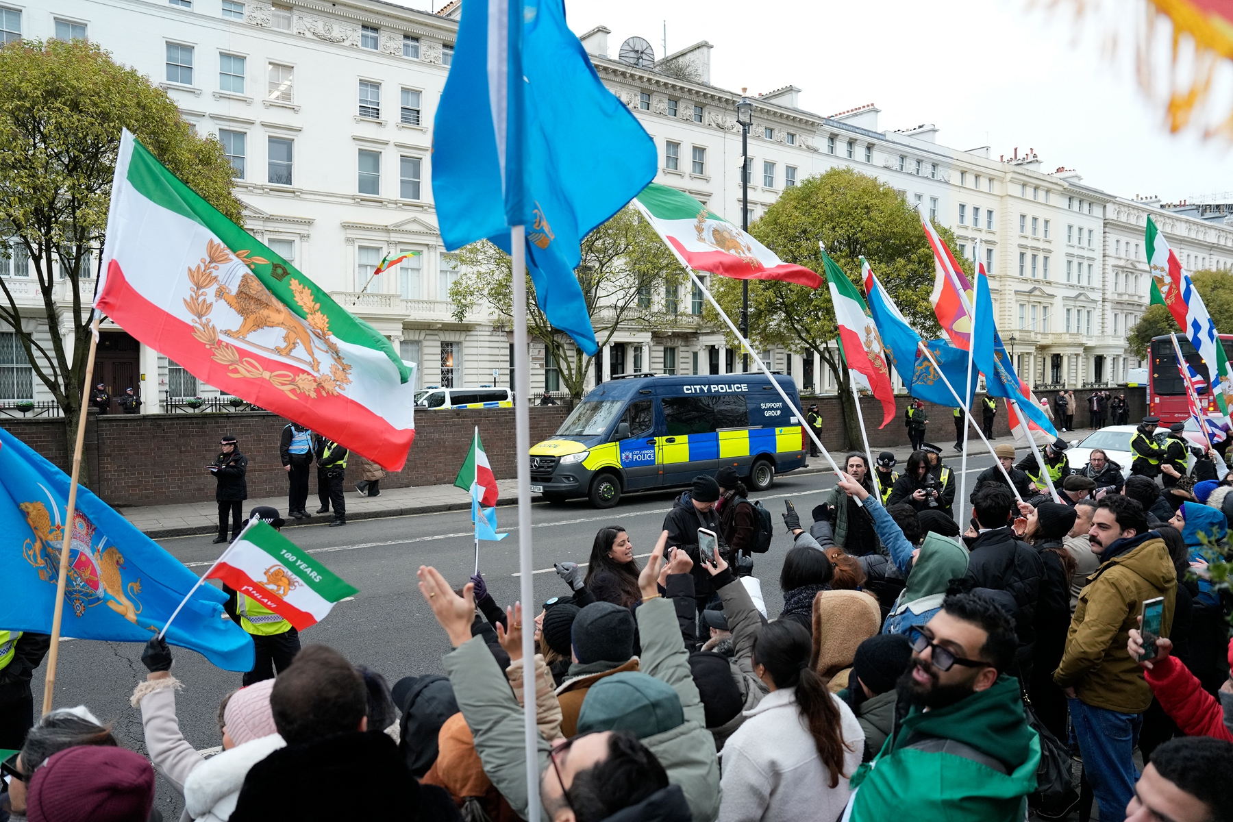 在伦敦,声援民众最初在伊朗大使馆前聚集,后来移至英国首相官邸外面,随着时间的推移,参与人数增加到数千人。现场飘扬着支持流亡美国的伊朗末代王储礼萨·巴列维的旗帜。