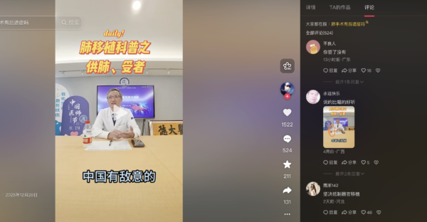 大纪元记者查证发现,2025年12月20日在陈静瑜抖音号发布的视频。在视频的评论区,不少大陆网民留言质疑他的说法:“说的比唱的好听。”“坚决抵制器官移植。”“失踪的人哪去了吗?”“希望陈医生做表率,带领自己十族率先签。”“都说医生有爱心,那教授应该更有爱心了,他们得给我们做榜样呀,让他们先捐。”
