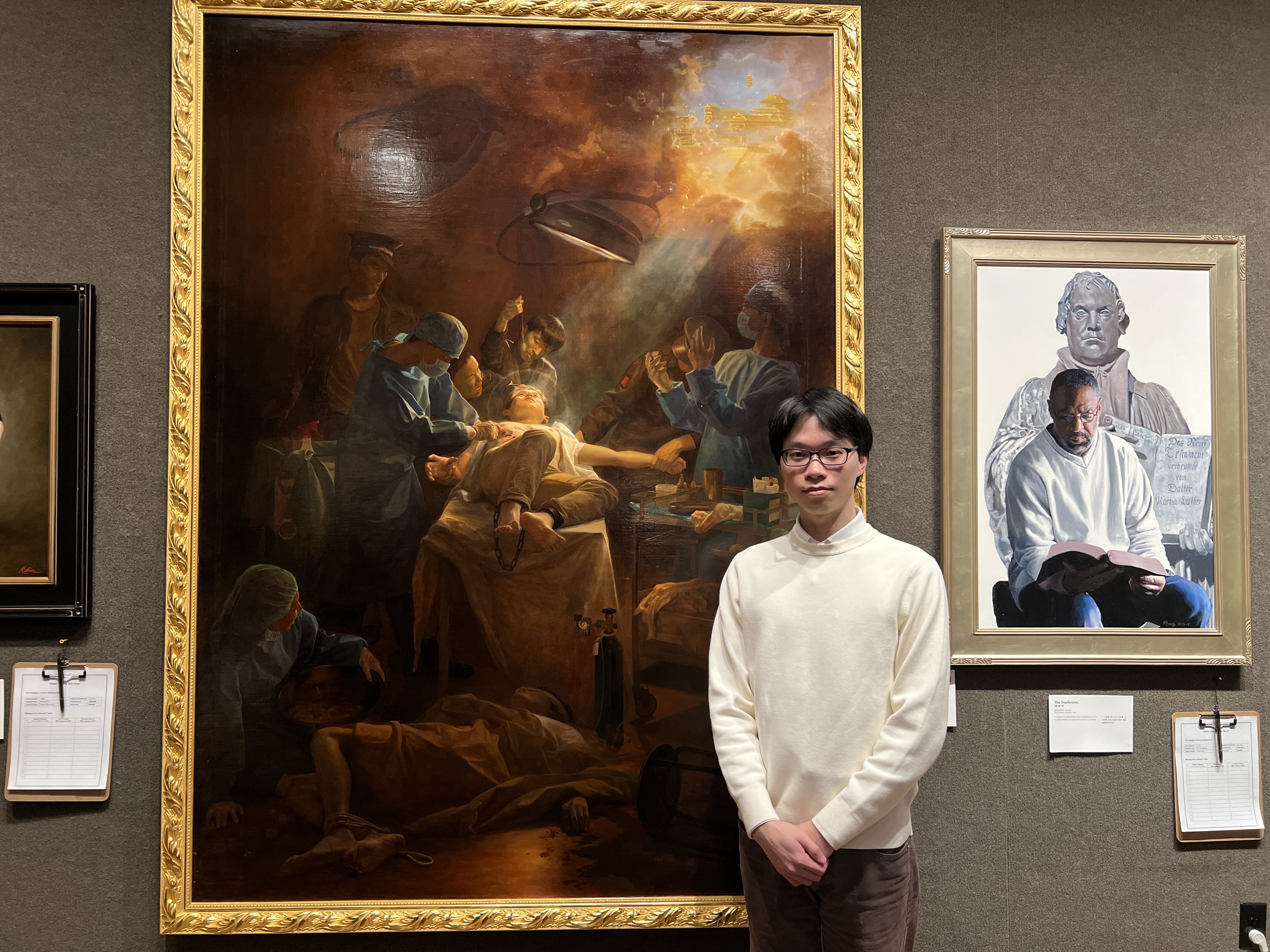来自台湾的蔡少航是第三次参加新唐人的油画大赛,他在上一届赛事中获得银奖。这次他带来的作品题目为“活摘器官”,聚焦发生在中国的人间悲剧。