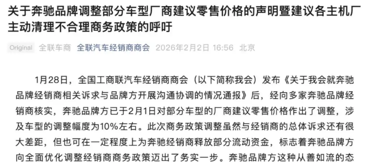全国工商联汽车经销商商会2月2日(周一)发布的《关于奔驰品牌调整部分车型厂商建议零售价格的声明暨建议各主机厂主动清理不合理商务政策的呼吁》显示:“经向多家奔驰品牌经销商核实,奔驰品牌方已于2月1日对部分车型的厂商建议零售价格作出了调整,涉及车型的调整幅度为10%左右。”