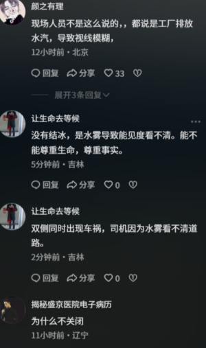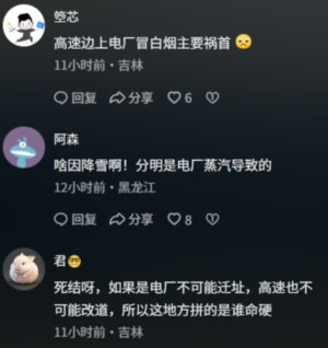 官方说法引发网友不满。不少当地网友留言表示,“啥因降雪啊!分明是电厂蒸汽导致的。”