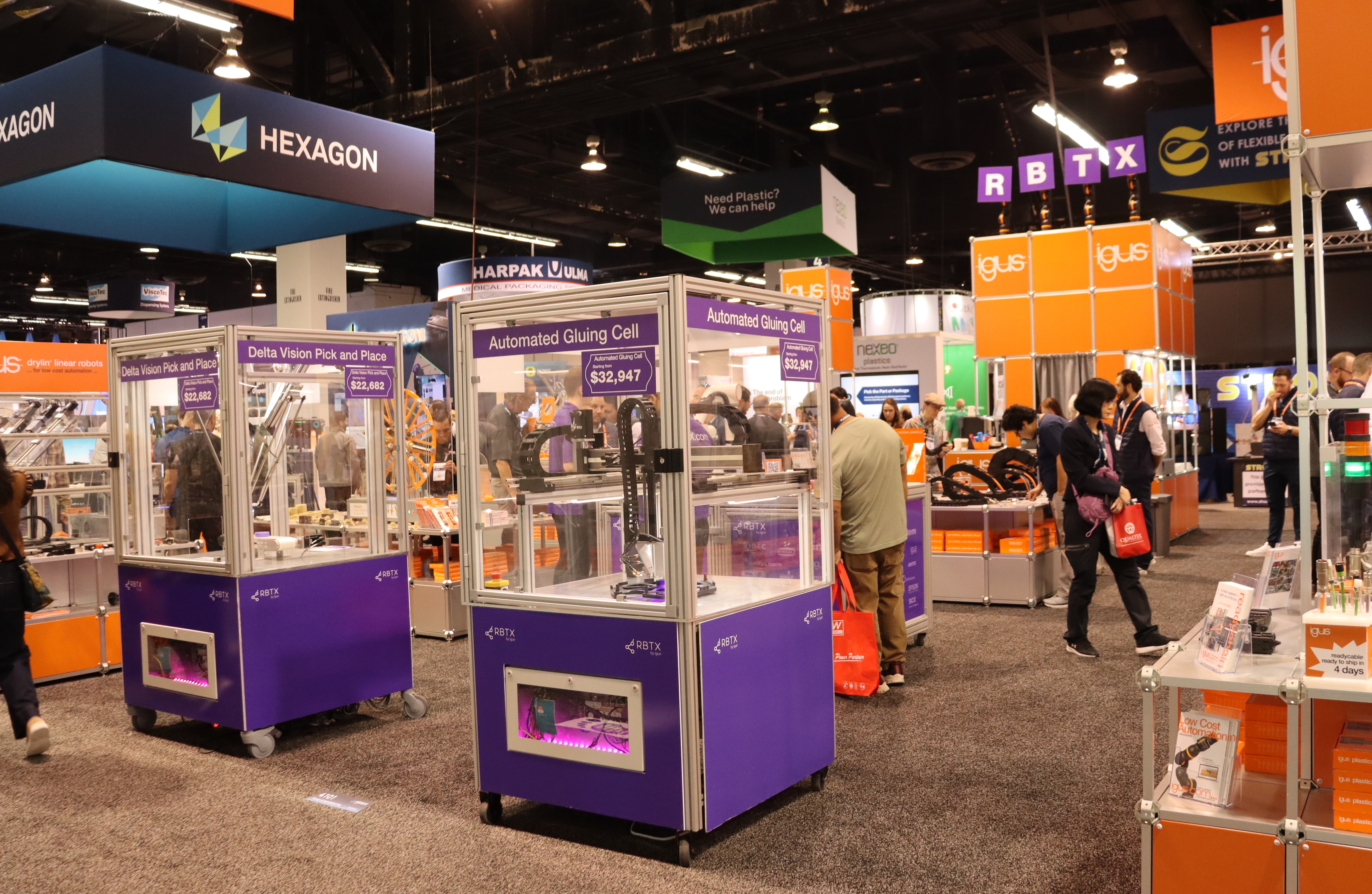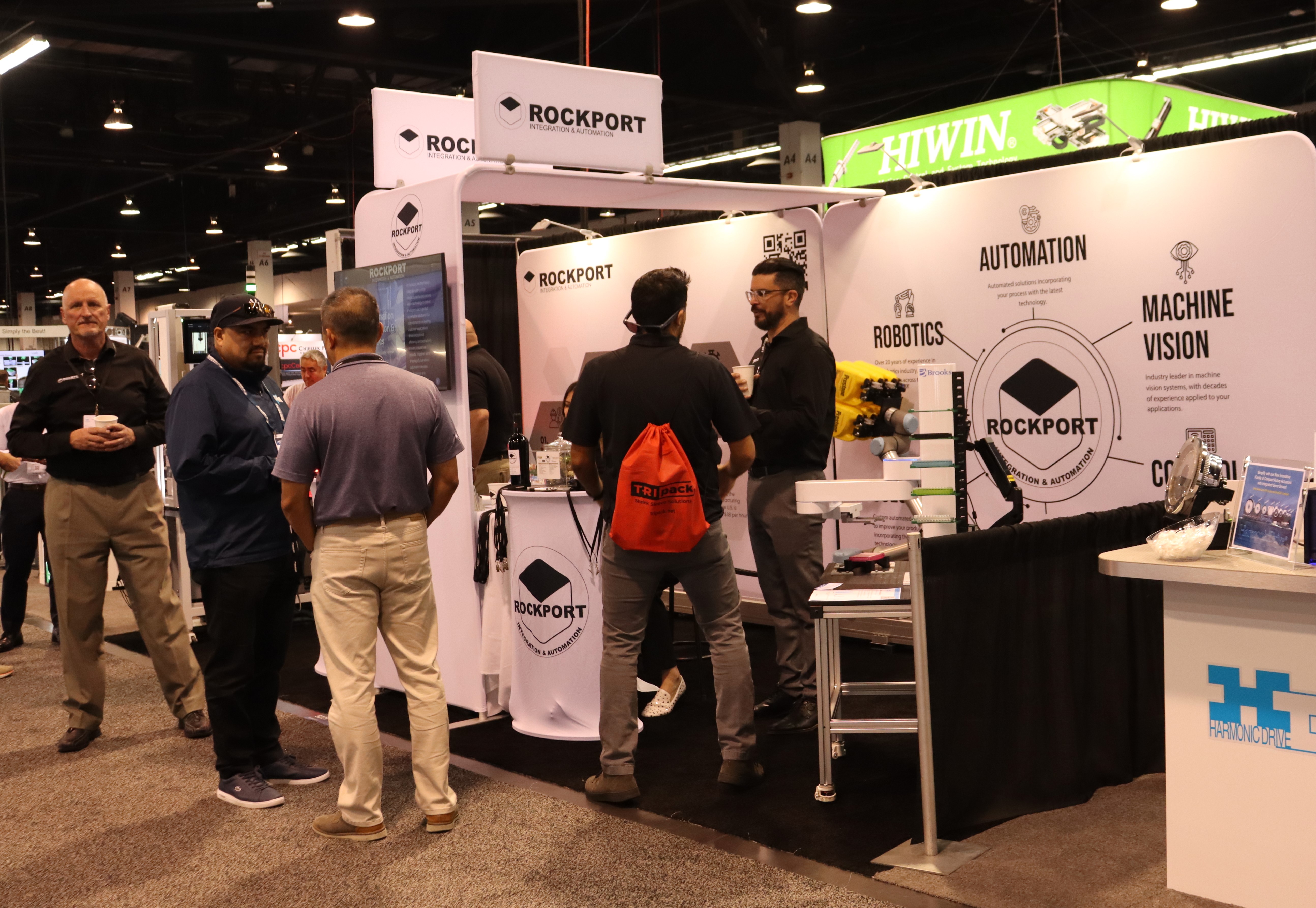 2026年2月3日,在第41届西部制造业展览(MDM West)上,来自佐治亚州科布县的“罗克波特集成自动化”公司(Rockport Integration Automation)展位,他们为企业提供自动化方案。(李梅/大纪元)