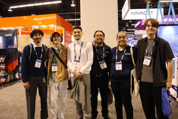 2026年2月3日,在第41届西部制造业展览(MDM West)上,几位来自河滨县环球技术学院(Universal Technical Institute,UTI)的参观展览的学生。(李梅/大纪元)