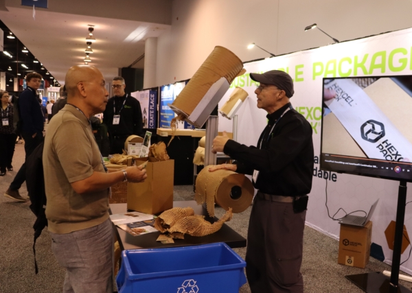 来自亚利桑那州的“六角形包装”(Hexclpack)有限责任公司的大卫‧古德里奇(David Goodrich)介绍了符合环保的牛皮纸包装材料:“我们使用加拿大木材行业的废弃木料,比塑料更有保护性,可以包装食品、医疗用品、酒类等各种各样的东西。我们的客户包括亚马逊、塔吉特(Target)、沃尔玛以及苹果公司等等。”
