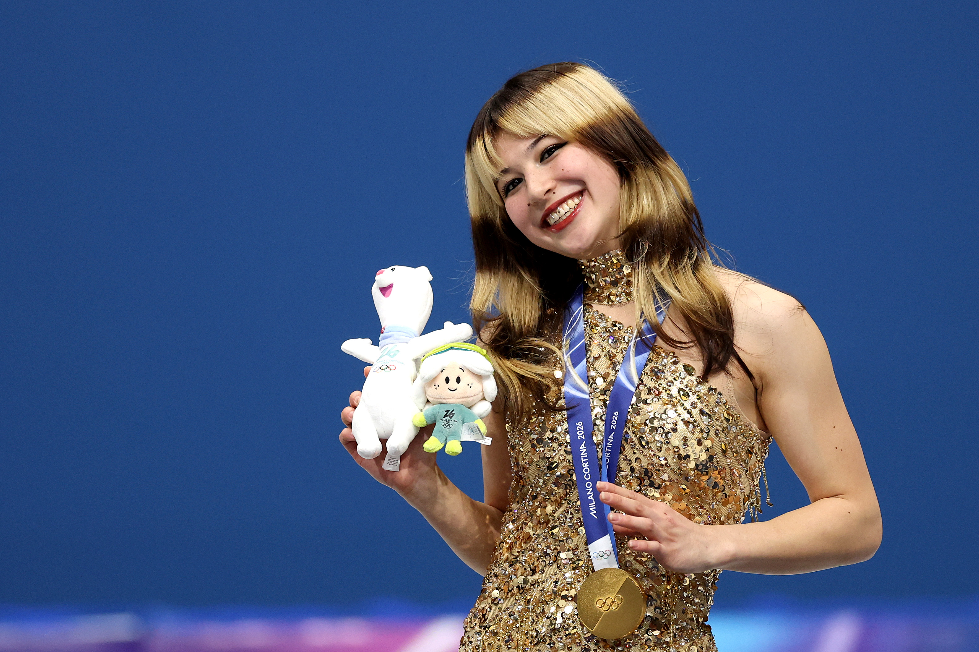 2026年2月19日,在意大利米兰举行的2026年米兰-科尔蒂纳丹佩佐冬奥会第13个比赛日中,女子单人滑颁奖仪式在米兰滑冰馆(Milano Ice Skating Arena)举行。金牌得主、美国队选手刘美贤(Alysa Liu)在领奖台上留影。(Jamie Squire/Getty Images)