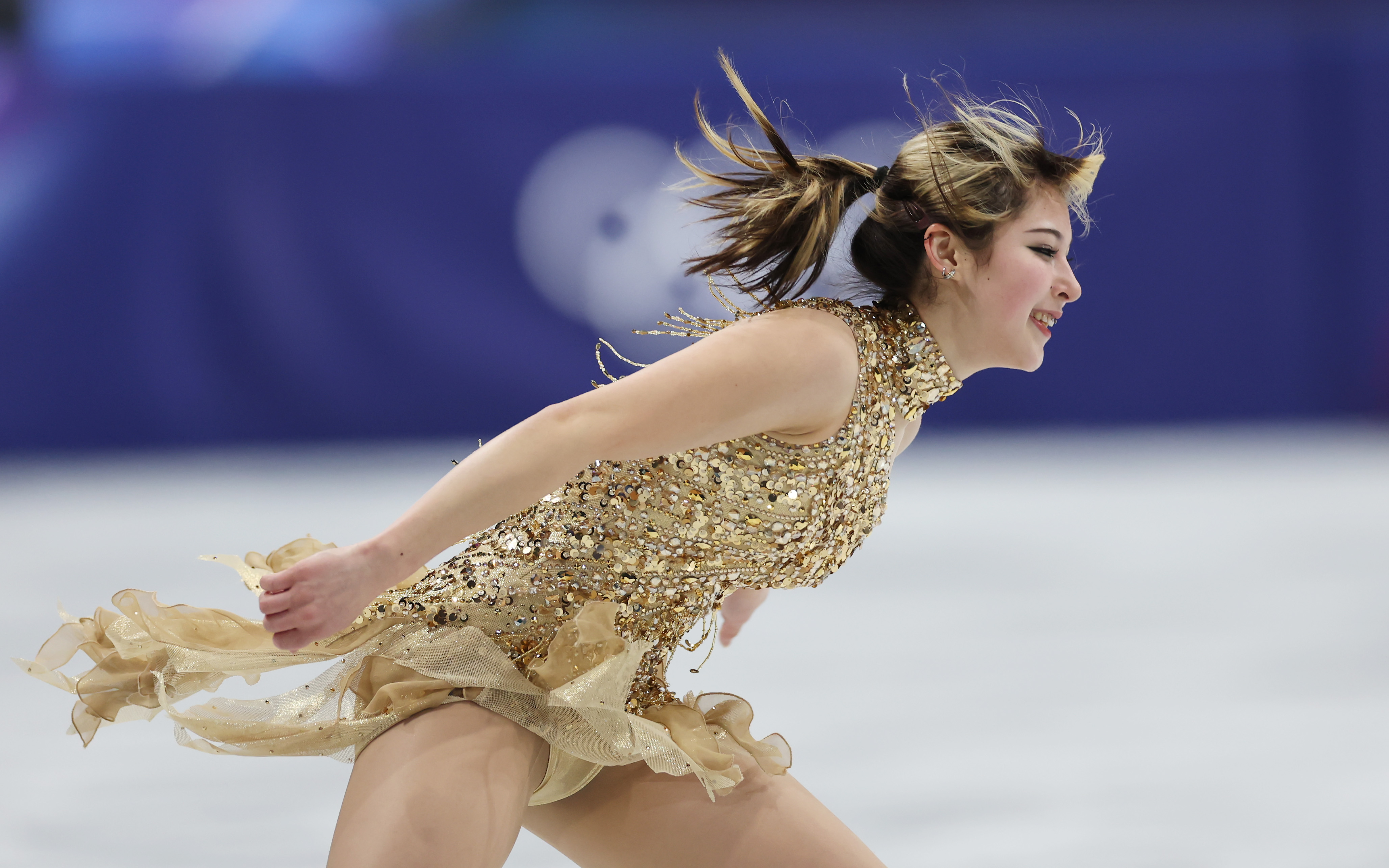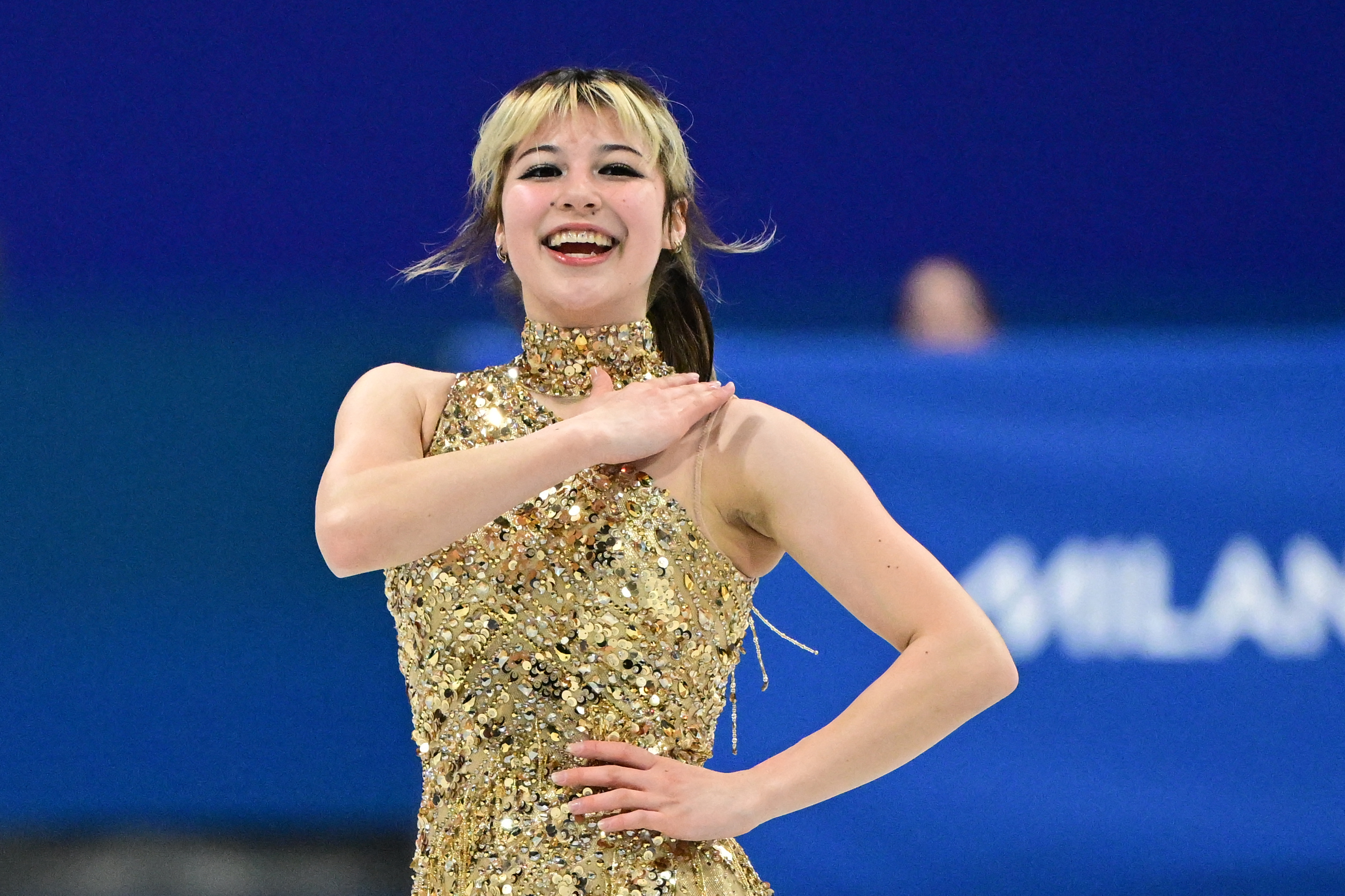 2026年2月19日,在意大利米兰举行的2026年米兰-科尔蒂纳丹佩佐冬奥会期间,美国选手刘美贤(Alysa Liu)在米兰滑冰馆(Milano Ice Skating Arena)参加女子单人滑自由滑决赛。(Piero Cruciatti/AFP via Getty Images)