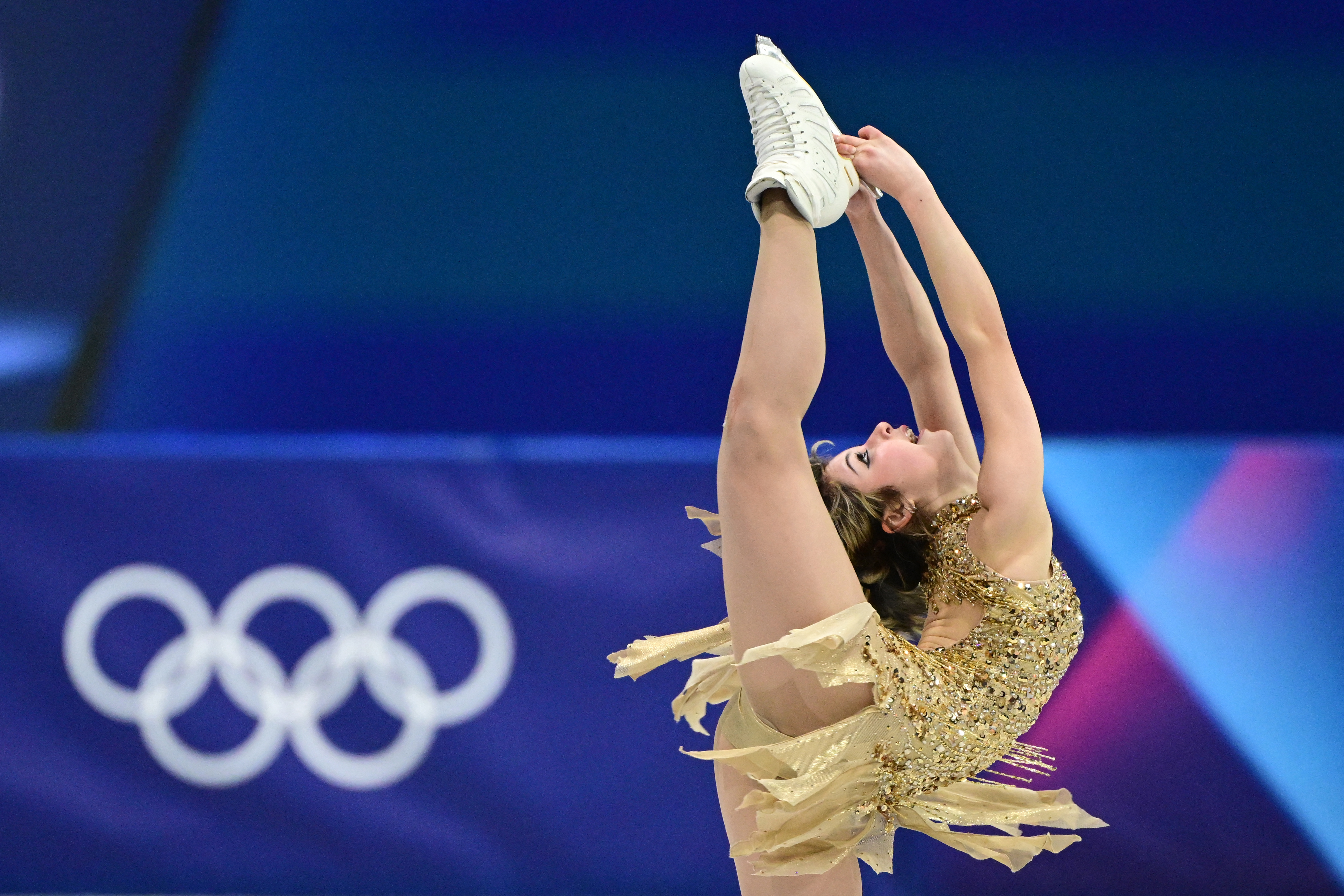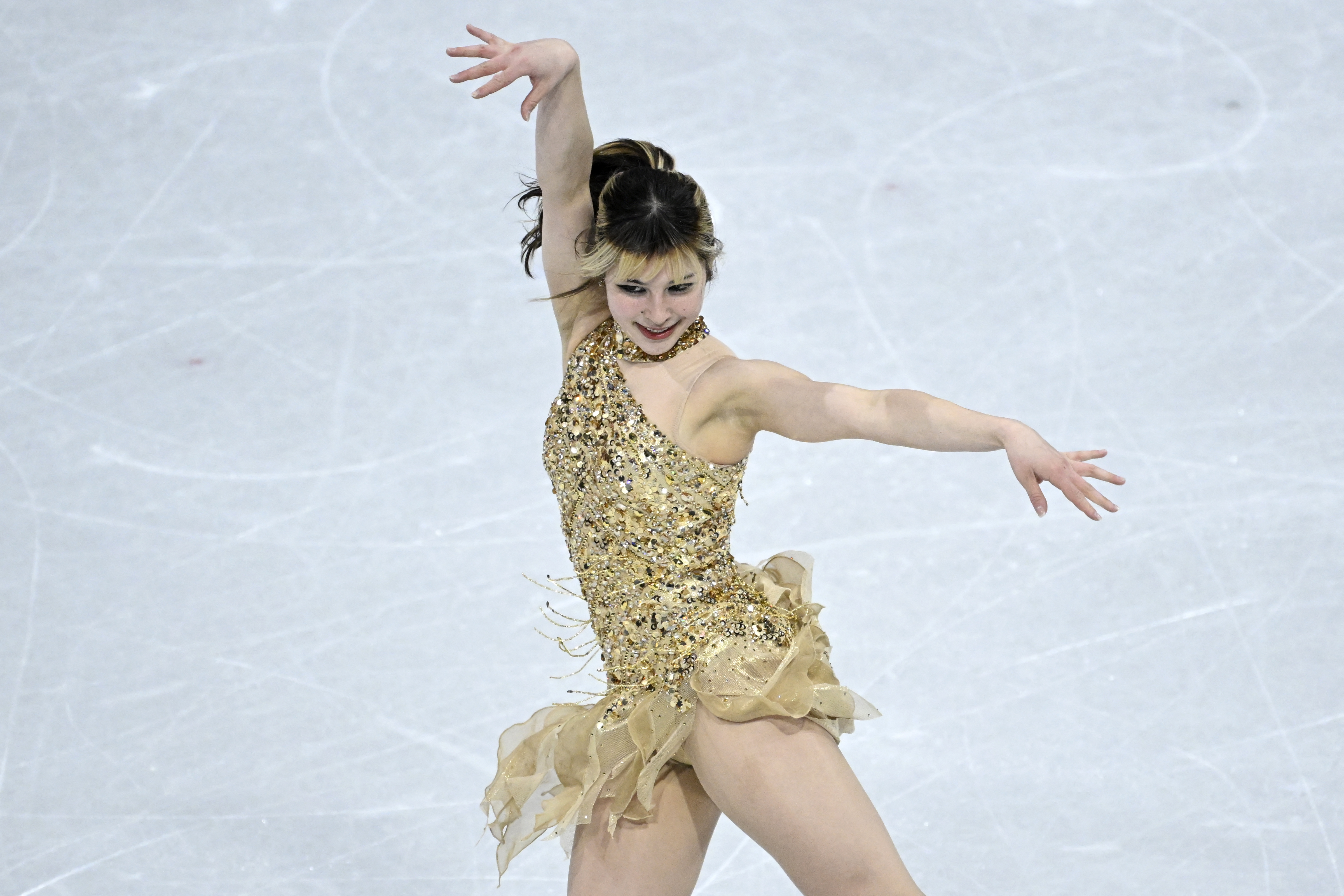 2026年2月19日,在意大利米兰举行的2026年米兰-科尔蒂纳丹佩佐冬奥会期间,美国选手刘美贤(Alysa Liu)在米兰滑冰馆(Milano Ice Skating Arena)参加女子单人滑自由滑决赛。(Wang Zhao/AFP via Getty Images)
