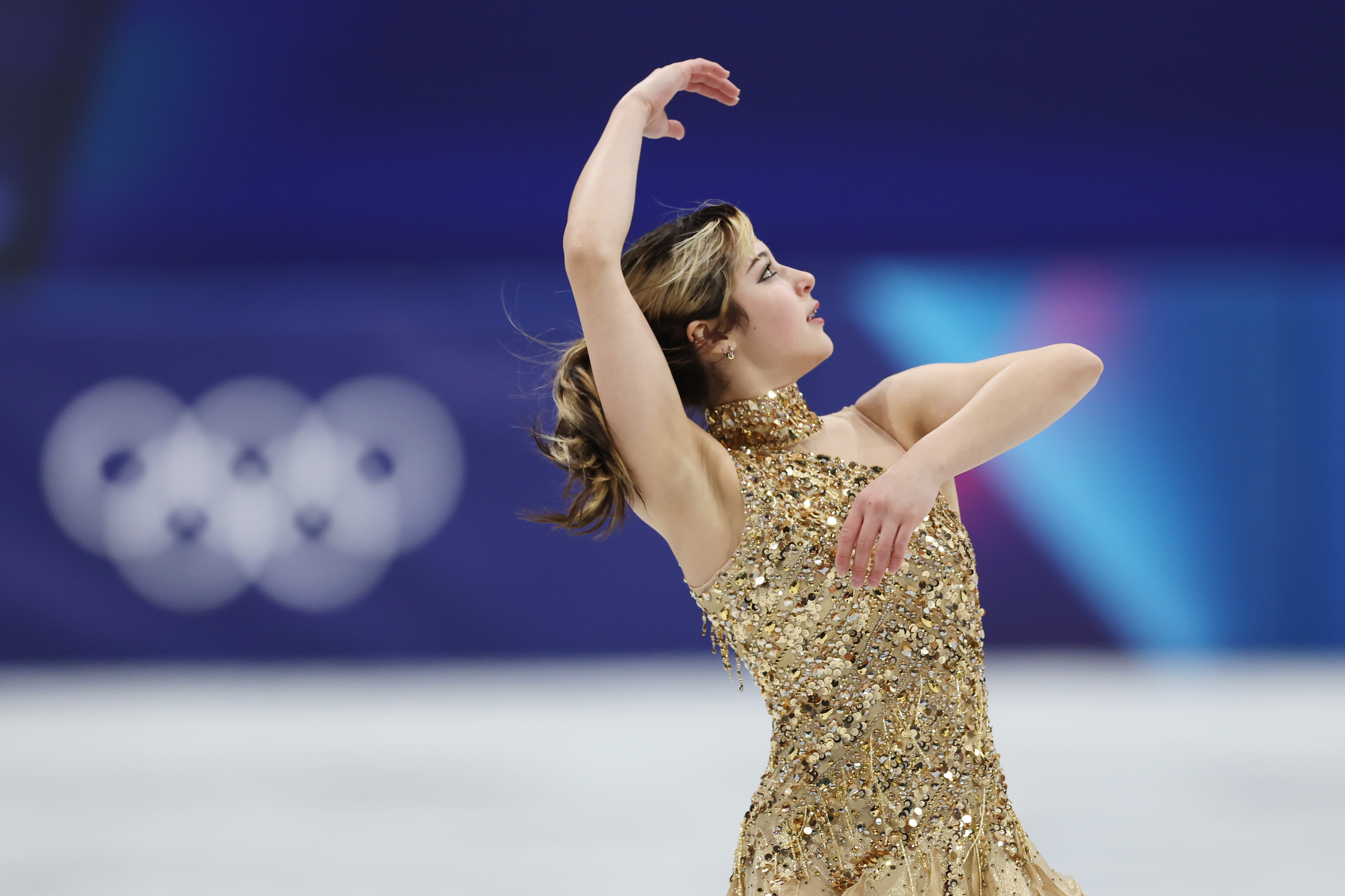 2026年2月19日,在意大利米兰举行的2026年米兰-科尔蒂纳丹佩佐冬奥会第13个比赛日中,美国队选手刘美贤(Alysa Liu)在米兰滑冰馆(Milano Ice Skating Arena)参加女子单人滑自由滑比赛。(Elsa/Getty Images)