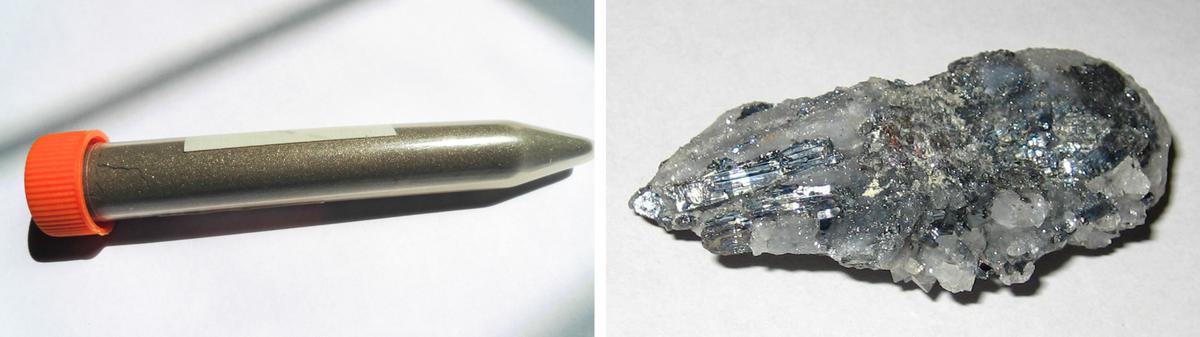 (左图)图中所示为纯度为99.5%的锑金属粉末。这种类金属是国防、人工智能和“绿色”技术的重要原料。(右图)图中所示为石英中天然结晶的锑。(Leiem/CC BY-SA 4.0, Styroks/CC0)