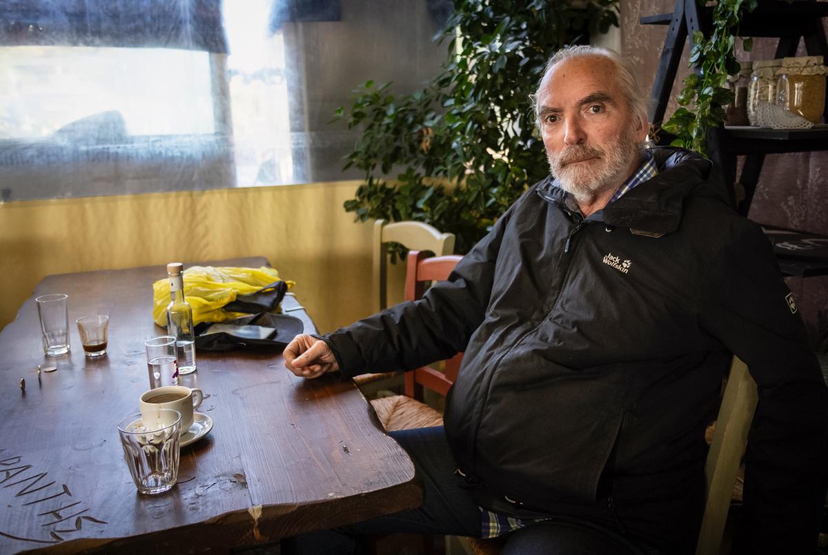 2025年11月14日,尼科斯‧米萨拉基斯(Nikos Mixalakis)在希腊希俄斯岛沃利索斯(Volissos)的一家咖啡馆里享用一杯齐普罗酒(tsipouro)。米萨拉基斯表示,他对岛上拟建的锑矿缺乏相关信息感到沮丧。(John Fredricks/英文大纪元)