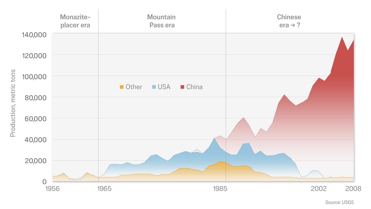图表显示了1956年—2008年间稀土元素的产量。期间经历了独居石砂矿(也称磷铈镧矿)时代(Monazite placers era,1956—1965年)、美国芒廷帕斯稀土矿时代(Mountain pass era,1965—1985年)和中共控制时代(Chinese era,1985—2008年)等。红色为中国产量,蓝色为美国产量,黄色为其它国家产量。数据来源:美国地质调查局(U.S. Geological Survey);制图:《大纪元时报》。