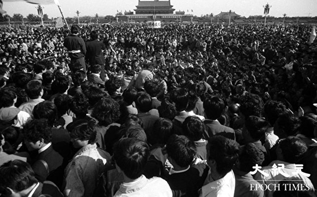 六四期间北京各个大学的大学生大游行,北京市民围观,并有市民随着学生游行,涌入天安门广场。(Jian Liu提供)