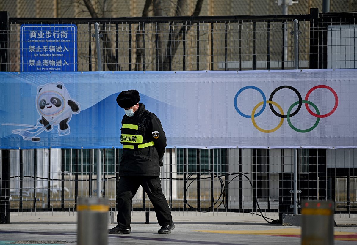 2022年1月18日,北京五棵松体育中心前北京冬奥会宣传展板。(Noel Celis/AFP)