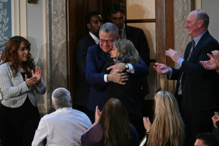 2026年2月24日,在美国国会大厦众议院会议厅举行的国情咨文演讲期间,委内瑞拉前总统候选人、最近获释的政治犯恩里克‧马尔克斯拥抱了一位家人。(Brendan Smialowski/AFP)
