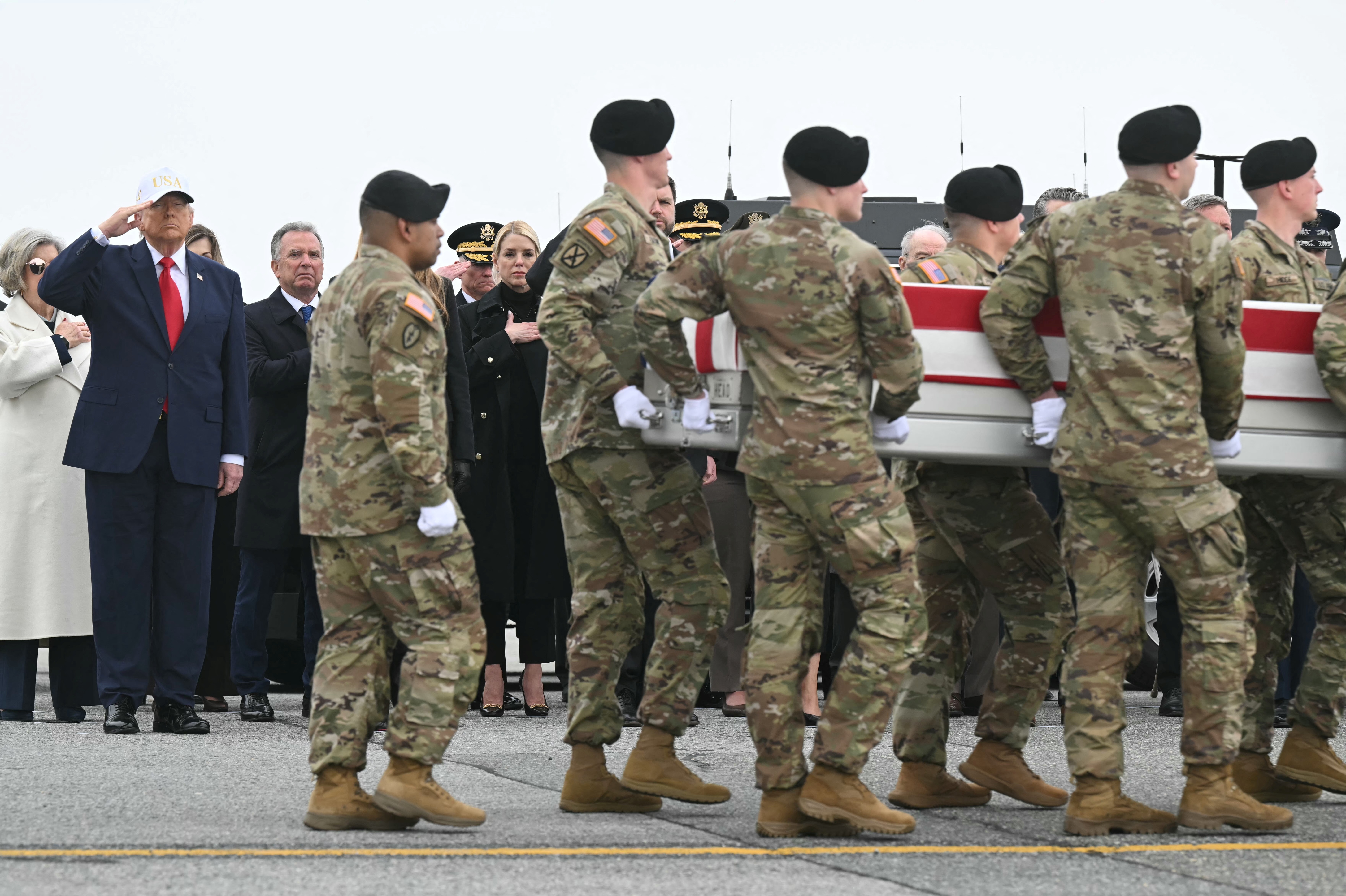 当地时间下午1:30左右,川普与第一夫人梅拉尼娅(Melania Trump)、副总统万斯(JD Vance)夫妇,以及包括战争部长皮特‧海格塞斯(Pete Hegseth)在内的内阁官员抵达现场,与金星家庭(Gold Star Families,指在战争或军事行动中失去亲属的美国士兵家属)会面,共同参与“庄严转运”(Dignified Transfer)。