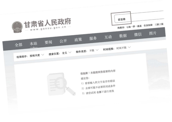 3月13日,甘肃政府官网的“省政府领导”一栏中,其“个人活动”报导列表已经被清空。在搜索栏搜索“雷思维”的名字,结果返回“很抱歉!未能搜到您想要的内容”。这与其他省政府官员不同。