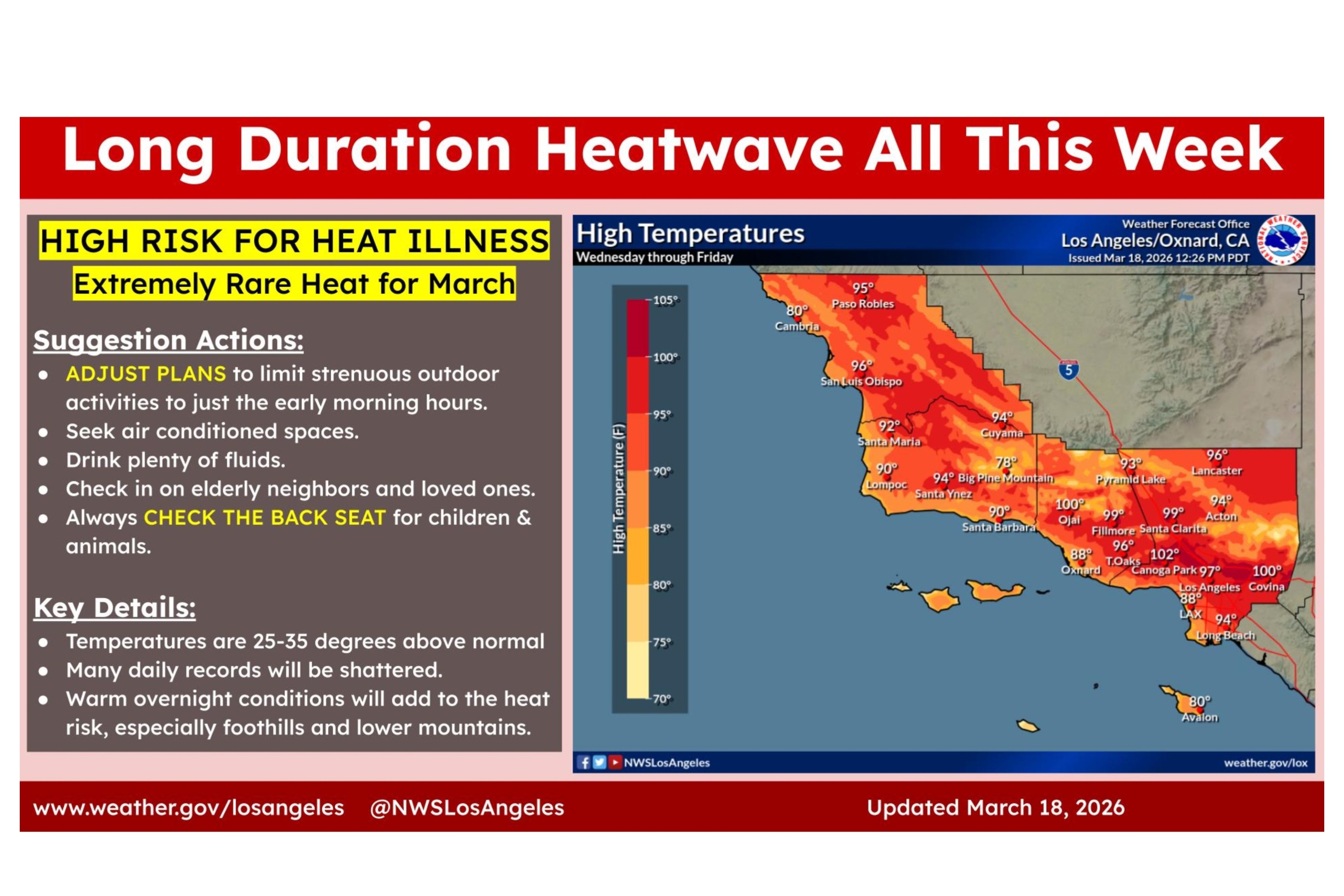 为避免中暑,NWS洛杉矶/奥克斯奈德分局紧急建议:将剧烈运动安排在清晨或傍晚;穿着轻便宽松的衣物,待在有空调的空间;避免阳光直射,多喝水;关心年长的邻居和亲友。