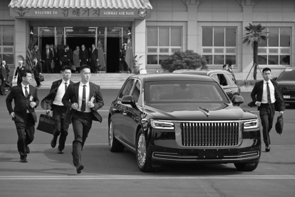 2025年10月30日,习近平在韩国釜山和川普会晤后乘车离开,中共保安人员跟着车辆跑。(Andrew Caballero-Reynolds/AFP via Getty Images)