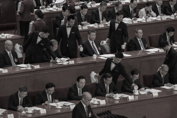 2026年3月9日:中共领导人习近平(中)及其他高级官员在北京大会堂出席全国人民代表大会第二次全体会议时享用茶点。(Kevin Frayer/Getty Images)