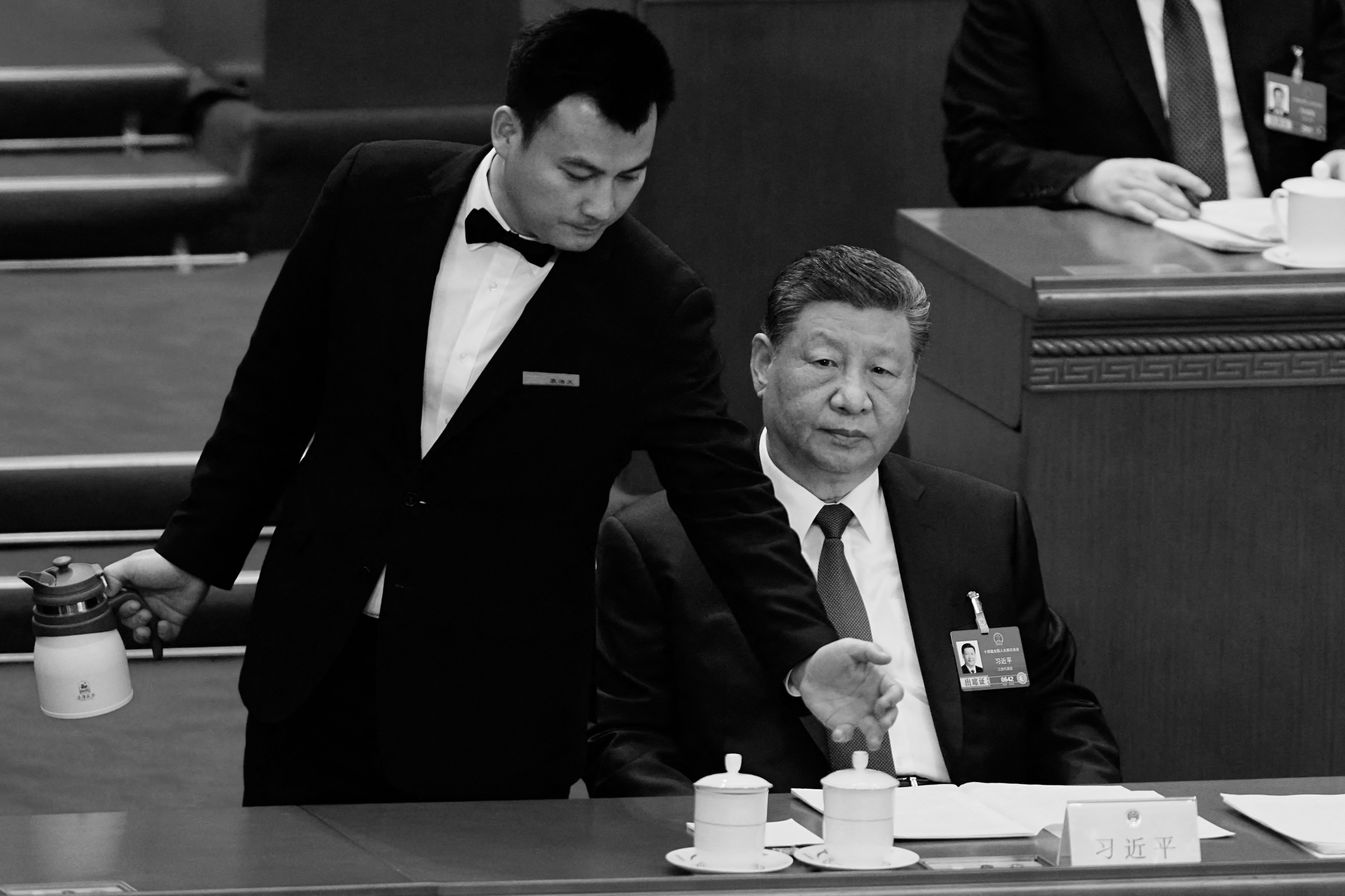 2026年3月9日,在北京举行的中共全国人民代表大会全体会议上,一名服务员为中共领导人习近平准备茶水。(Vincent Thian/POOL/AFP via Getty Images)