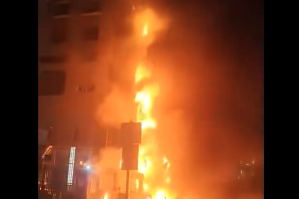 当地应急管理部门回应说,明火已经被扑灭,起火原因还不太清楚。现场消防人员说,最开始是楼下一家饭店着火,然后把外墙引燃,火才一路往上烧。
