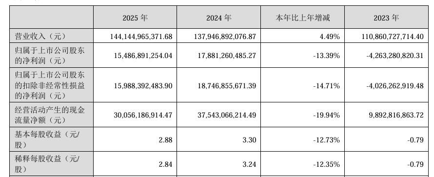 牧原股份在28日的《2025 年年度报告》中表示:“公司实现营业收入1,441.45 亿元,较上年同期增加4.49%;实现净利润158.12 亿元,同比下降16.45%。” 同时,归属于上市公司股东的净利润154.87亿元,同比下降13.39%;归属于上市公司股东的扣除非经常性损益的净利润159.88亿元,同比下降14.71%;基本每股收益2.88元,同比下降12.73%。