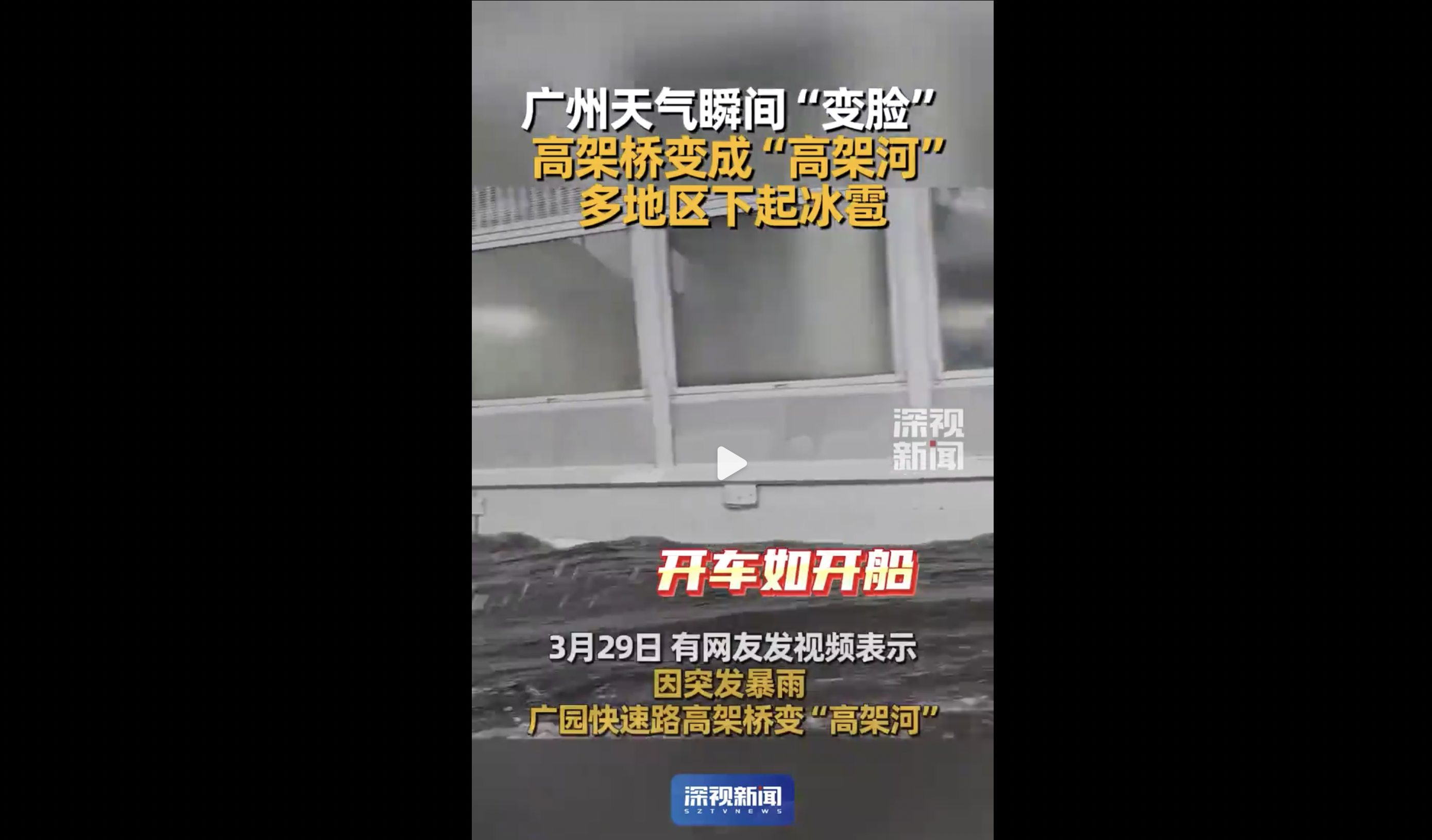 【大纪元2026年03月30日讯】(大纪元记者方晓报导)大陆2026年首波大范围强对流天气席卷南方省市,广东广西多地自3月29日起紧急发出冰雹、雷雨及大风预警。广州市一小时降雨量就达54.8厘米,被称为“高压水枪式”的突击。民众称之为广州超级大暴雨,乌云压境,天瞬间变黑,高架桥瞬间变“高架河”,开车如开船。