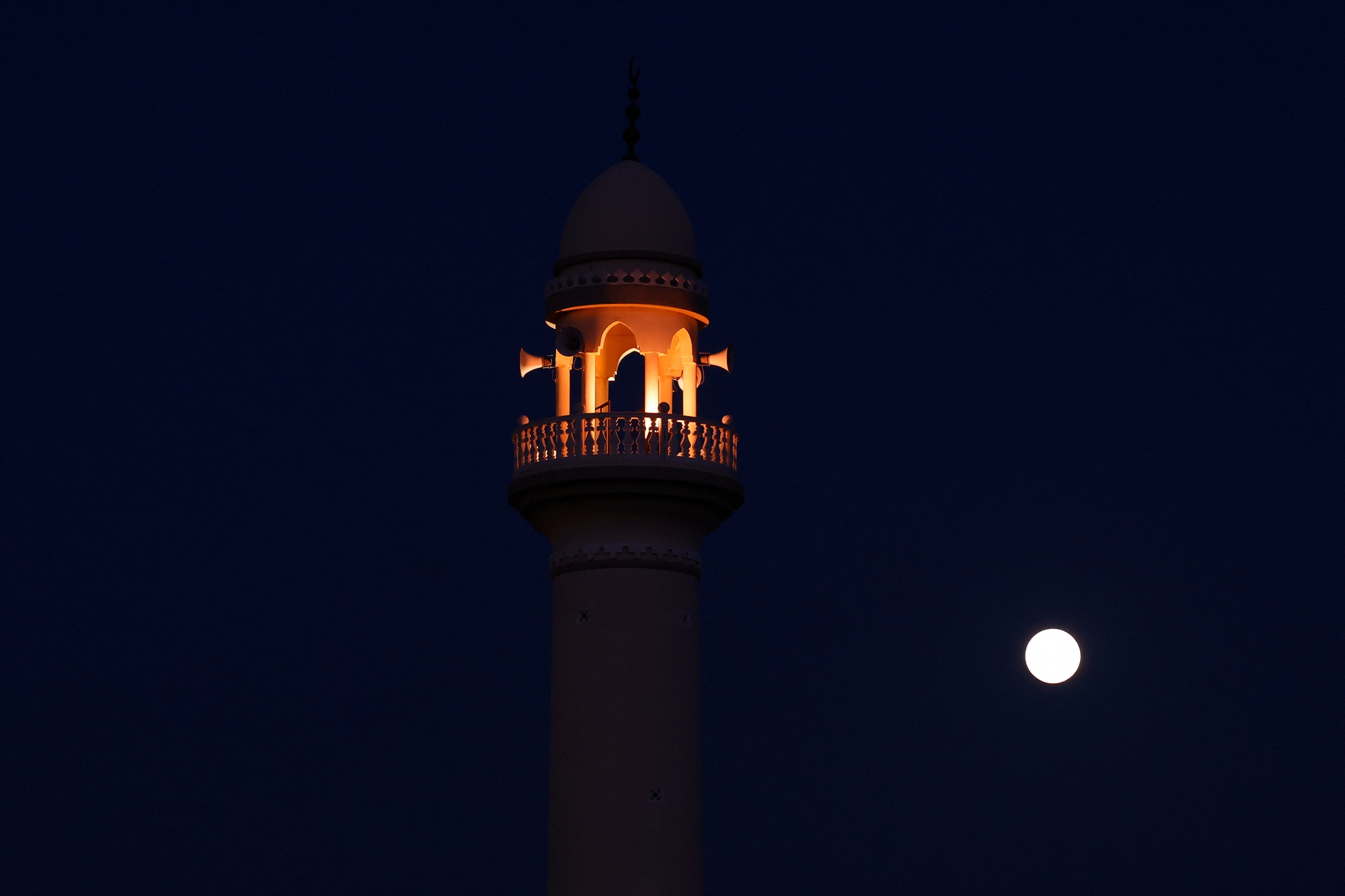 2026年4月1日晚间,一轮皎洁的圆月在卡塔尔首都多哈的夜空中缓缓升起。(Karim Jaafar/AFP via Getty Images)