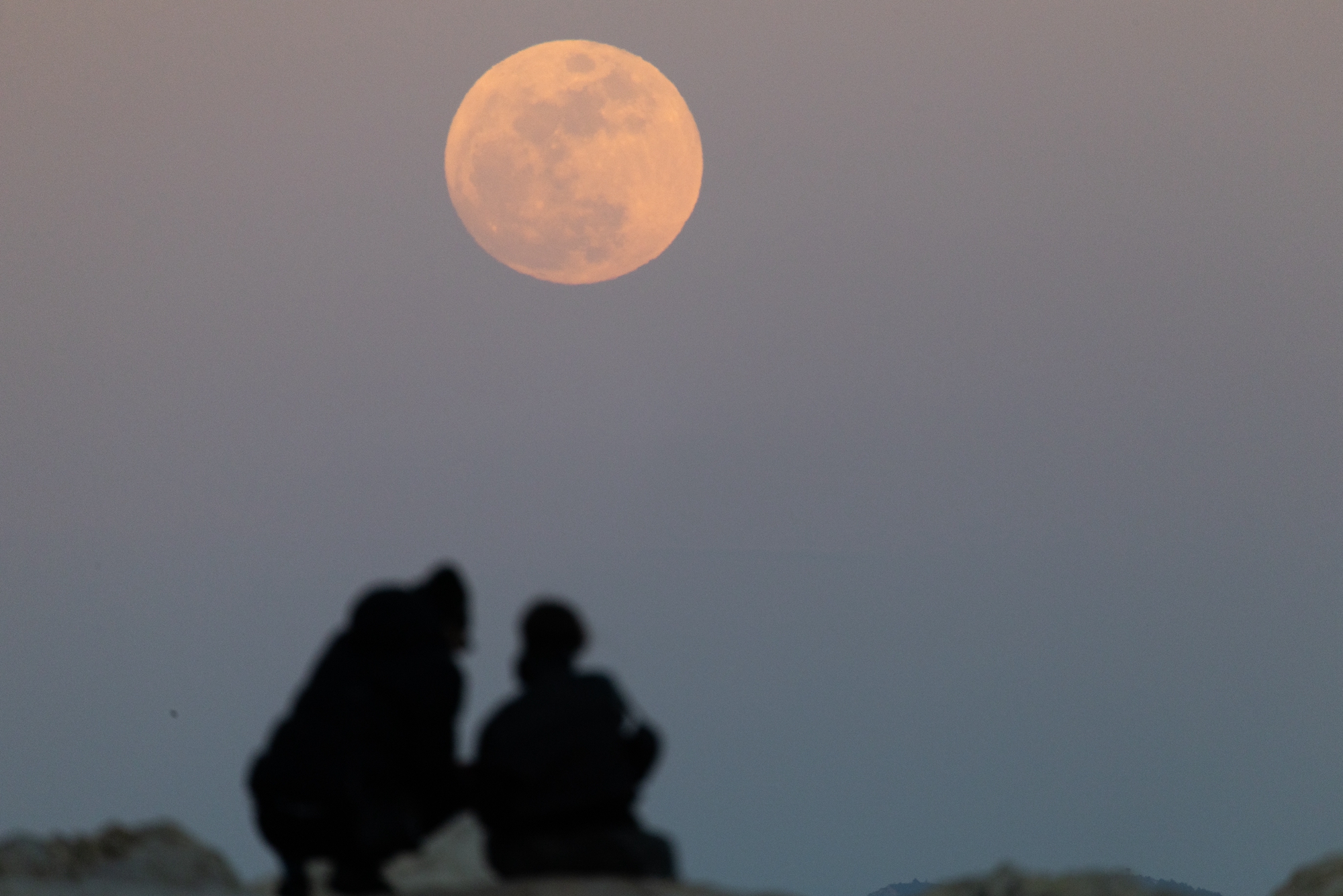 2026年4月1日晚间,一对夫妇在法国东南部港口城市马赛(Marseille)观看夜空中的“粉红月亮”。(Thibaud Moritz/AFP via Getty Images)