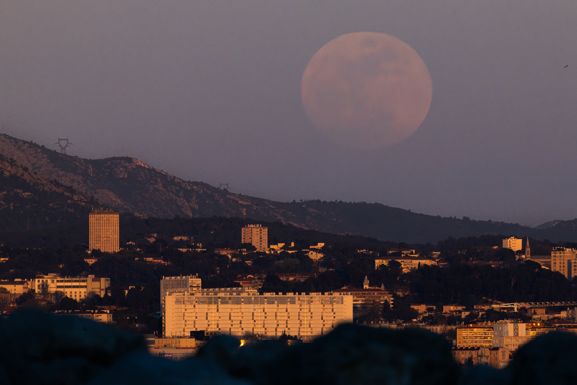 2026年4月1日晚间,一轮硕大的圆月从法国东南部港口城市马赛(Marseille)的夜空中缓缓升起。(Thibaud Moritz/AFP via Getty Images)