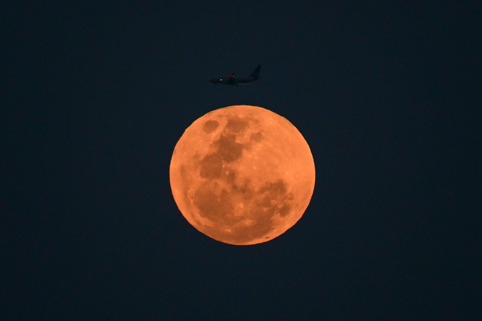 2026年4月1日晚间,一架客机从德国法兰克福上空出现的满月前飞过。(Kirill Kudryavtsev/AFP via Getty Images)