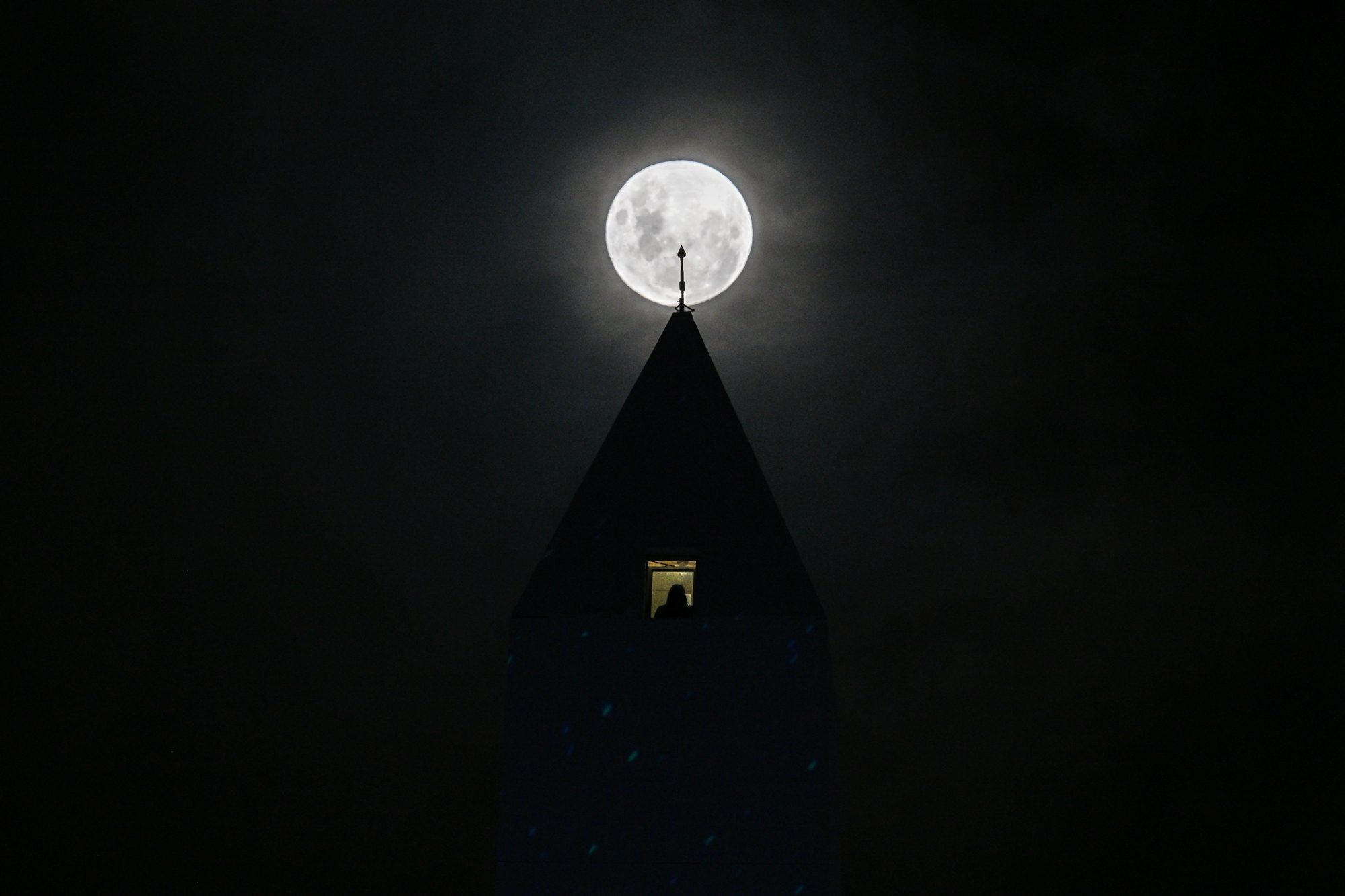 2026年4月1日晚间,一个人从阿根廷首都布宜诺斯艾利斯市中心的地标性建筑方尖碑的观景台上观看“粉红月亮”。(Luis Robayo/AFP via Getty Images)