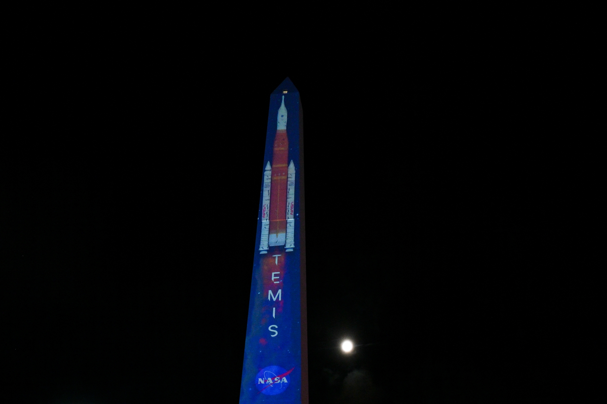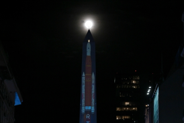 2026年4月1日晚间,在布宜诺斯艾利斯市中心的方尖碑展示美国宇航局“阿尔忒弥斯二号”任务火箭发射升空的投影影像期间,一轮皎洁的圆月从其后方缓缓升起。(Luis Robayo/AFP via Getty Images)