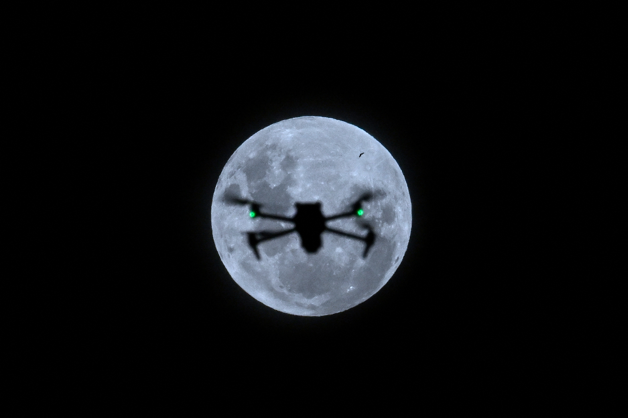 2026年4月1日晚间,一轮圆月高悬在阿根廷首都布宜诺斯艾利斯的夜空中,一只鸟和一架无人机与其罕见同框。(Luis Robayo/AFP via Getty Images)