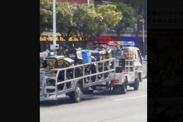 4月1日已有大量电动自行车被拖离。在深圳华强北世纪汇,停放在路边的电车会被直接拖去秤重,超重会被拖到交管大队。现场视频显示,有多辆外卖骑手的车被拖走。(视频链接)