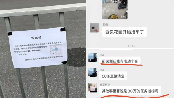 杨先生告诉大纪元记者:“我的车停在地铁站口被拖走了,现在在龙岗扣车场在等通知,现在他们在抓超标和没上牌的。我的应该是超标。”