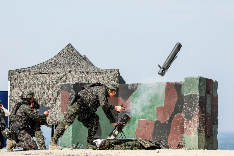 2026年1月29日,在台湾高雄左营基地举行的演习中,士兵正在发射小型攻击无人机。(I-Hwa Cheng/AFP via Getty Images)