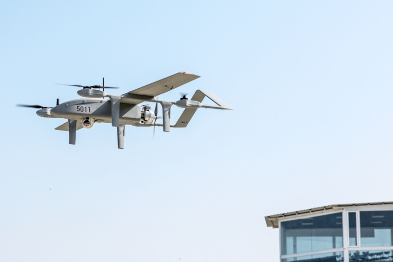 2026年1月29日,一架陆基侦察无人机出现在台湾高雄左营基地举行的演习中。(I-Hwa Cheng/AFP via Getty Images)