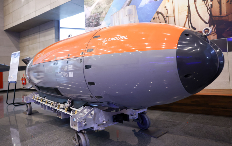 2026年3月30日,自主水下航行器(AUV)Dive-LD在台湾桃园的中山科学研究院大厅展出。(I-Hwa Cheng/AFP via Getty Images)