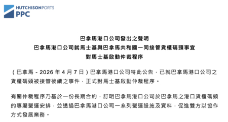 4月7日,香港长江和记实业有限公司(长和)旗下巴拿马港口公司发表声明,宣布已就货柜码头被接管一事,正式对全球航运巨头马士基启动仲裁程序,仲裁将在伦敦进行。